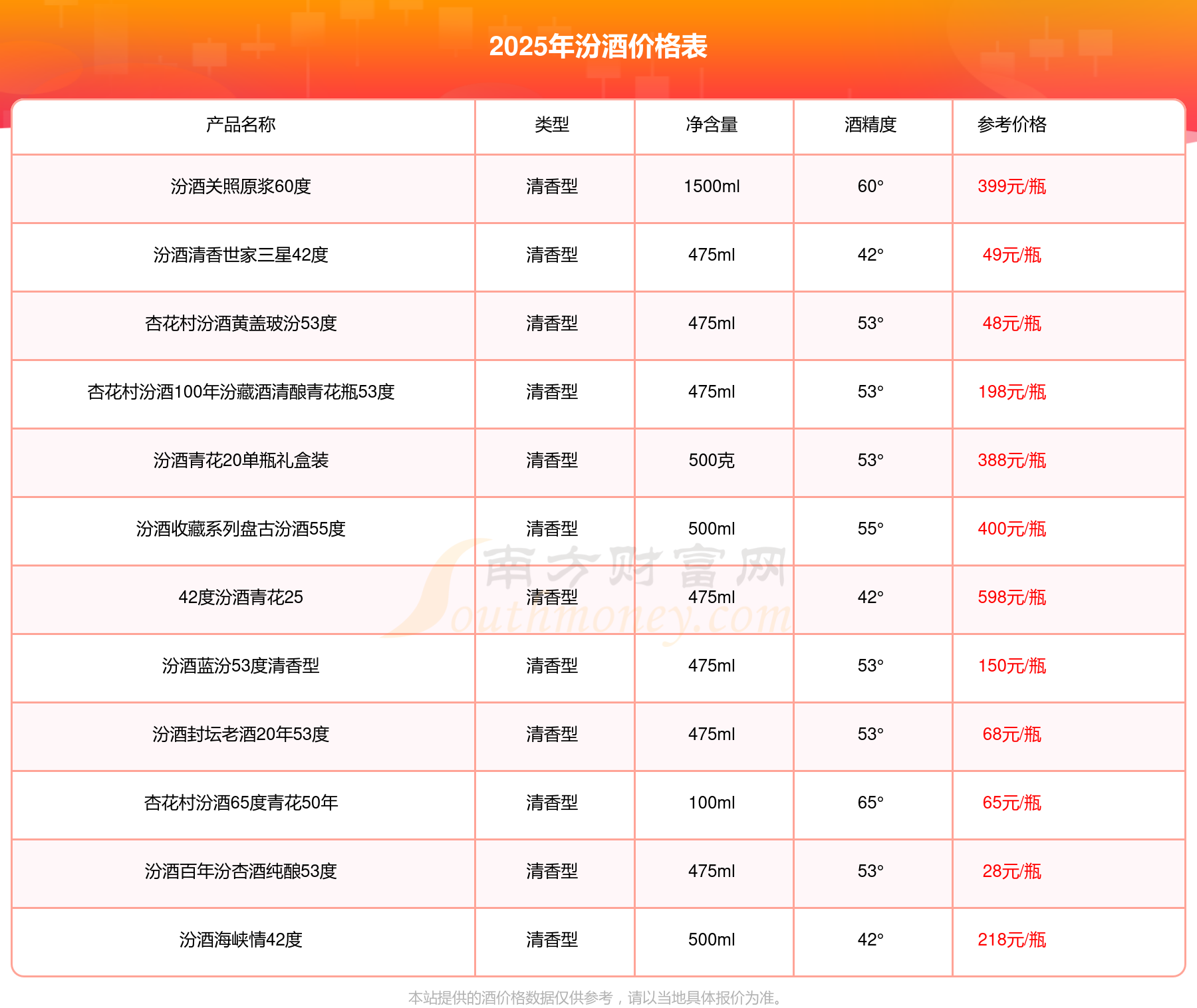 2025年,汾酒原漿一壇香60°3000ml、汾酒原漿一壇香60°1500ml、42度汾酒青花25、汾酒收藏系列盤古汾酒55度、汾酒關(guān)照原漿60度等汾酒價(jià)格如下:汾酒原漿一壇香60°3000ml參考價(jià)2180元/瓶、汾酒原漿一壇香60°1500ml參考價(jià)1536元/瓶、42度汾酒青花25參考價(jià)598元/瓶、汾酒收藏系列盤古汾酒55度參考價(jià)400元/瓶、汾酒關(guān)照原漿60度參考價(jià)399元/瓶。