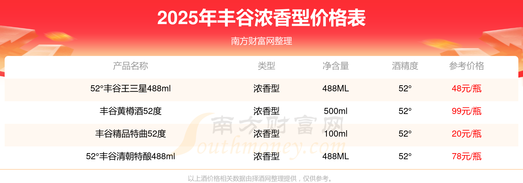 豐谷黃樽酒52度參考價99元/瓶、52°豐谷清朝特釀488ml參考價78元/瓶、52°豐谷王三星488ml參考價48元/瓶、豐谷精品特曲52度參考價20元/瓶。