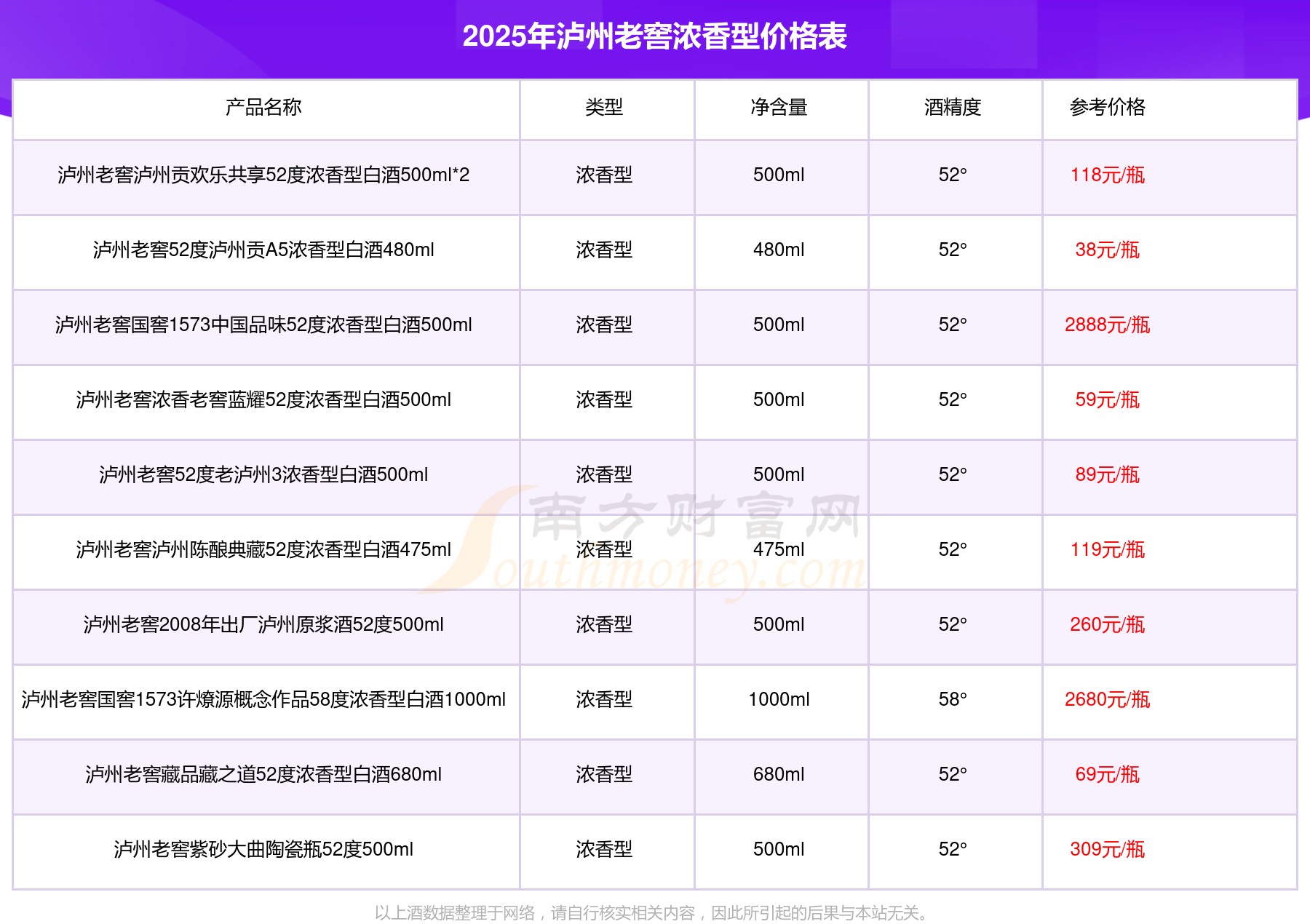 2025年,瀘州老窖濃香型酒價格最高的是瀘州老窖國窖1573春釀鼠兆豐年E 55度,參考價17999元,最低的是瀘州老窖45度五洲醉8窖經(jīng)典小酒版濃香型100ml,參考價10元,價格高低差為17989元。