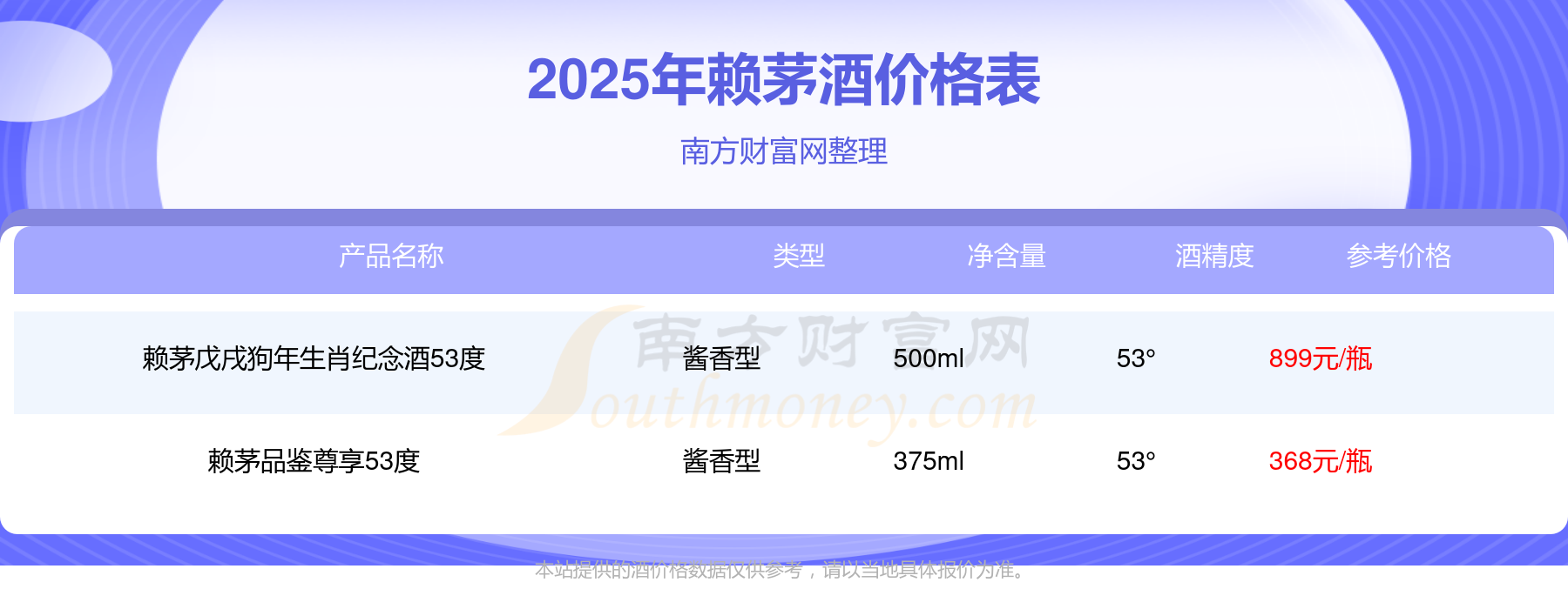 賴茅酒最新價(jià)格2025:賴茅戊戌狗年生肖紀(jì)念酒53度參考價(jià)899元/瓶、賴茅品鑒尊享53度參考價(jià)368元/瓶。