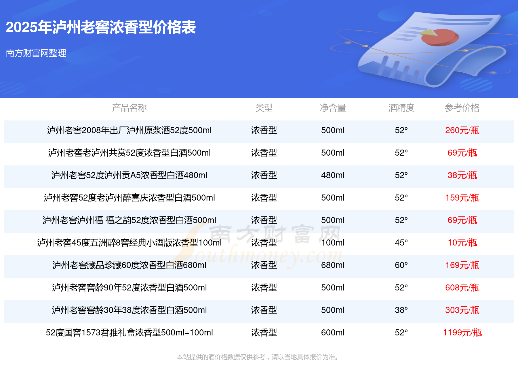2025年,瀘州老窖國(guó)窖1573春釀鼠兆豐年E 55度、瀘州老窖國(guó)窖1573生命中的那壇酒55度014、瀘州老窖國(guó)窖1573春釀鼠兆豐年A 55度、瀘州老窖國(guó)窖1573生命中的那壇酒55度013濃香型白酒1000ml、瀘州老窖國(guó)窖1573生命中的那壇酒55度009 1000ml、瀘州老窖國(guó)窖1573中國(guó)品味52度濃香型白酒500ml等瀘州老窖濃香型酒價(jià)格如下:瀘州老窖國(guó)窖1573春釀鼠兆豐年E 55度參考價(jià)17999元/瓶、瀘州老窖國(guó)窖1573生命中的那壇酒55度014參考價(jià)9999元/瓶、瀘州老窖國(guó)窖1573春釀鼠兆豐年A 55度參考價(jià)5088元/瓶、瀘州老窖國(guó)窖1573生命中的那壇酒55度013濃香型白酒1000ml參考價(jià)4988元/瓶、瀘州老窖國(guó)窖1573生命中的那壇酒55度009 1000ml參考價(jià)4288元/瓶、瀘州老窖國(guó)窖1573中國(guó)品味52度濃香型白酒500ml參考價(jià)2888元/瓶。