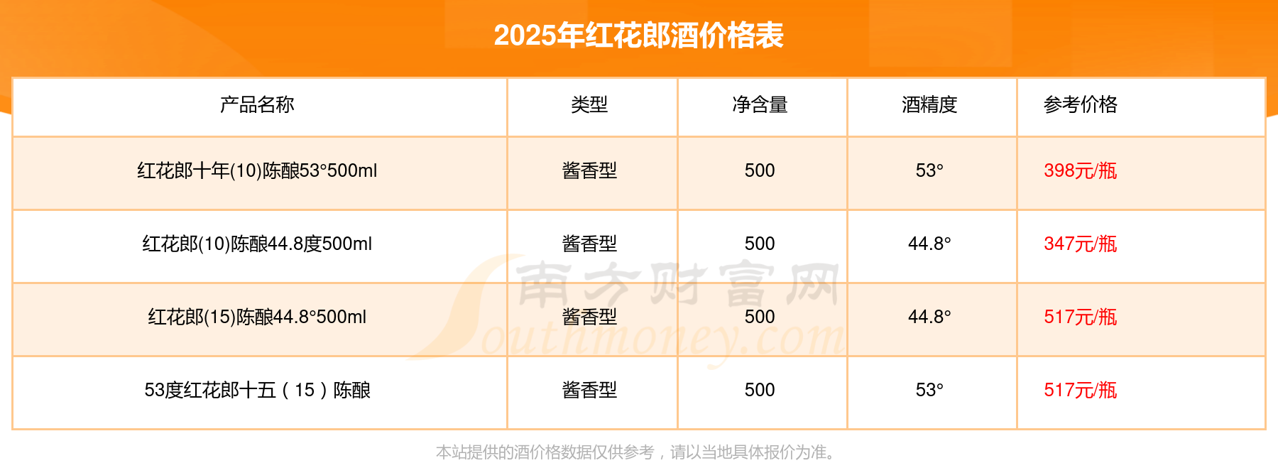 2025年紅花郎酒53度紅花郎十五(15)陳釀、紅花郎(15)陳釀44.8°500ml、紅花郎十年(10)陳釀53°500ml、紅花郎(10)陳釀44.8度500ml等最新價(jià)格如下: