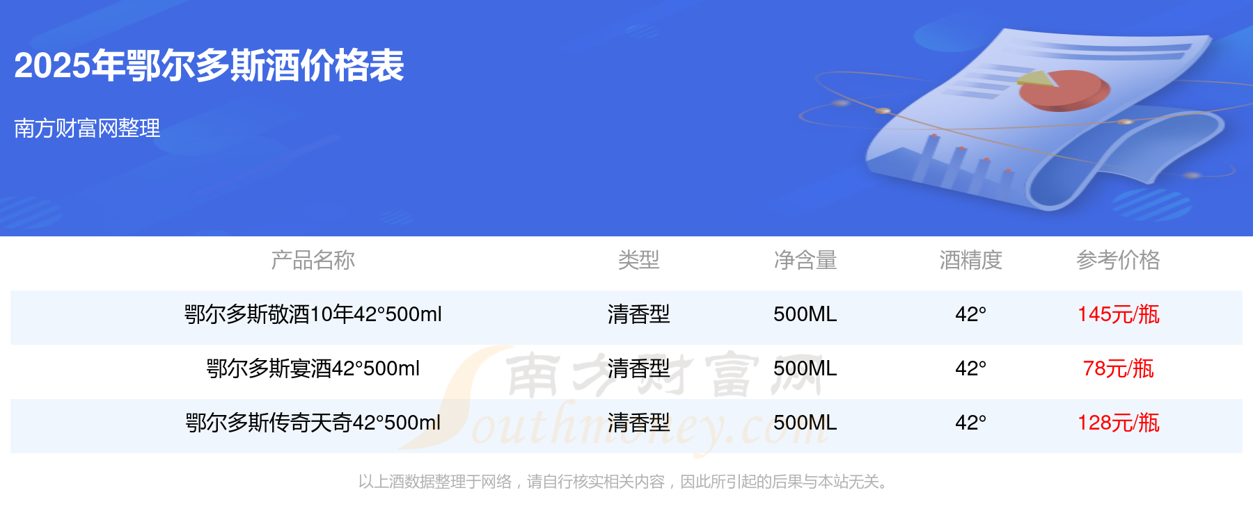 2025年,鄂爾多斯敬酒10年42°500ml、鄂爾多斯傳奇天奇42°500ml、鄂爾多斯宴酒42°500ml等鄂爾多斯酒價(jià)格如下:鄂爾多斯敬酒10年42°500ml參考價(jià)145元/瓶、鄂爾多斯傳奇天奇42°500ml參考價(jià)128元/瓶、鄂爾多斯宴酒42°500ml參考價(jià)78元/瓶。