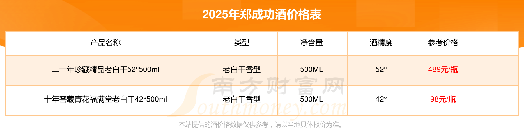 鄭成功酒最新價(jià)格2025:二十年珍藏精品老白干52°500ml參考價(jià)489元/瓶、十年窖藏青花福滿堂老白干42°500ml參考價(jià)98元/瓶。