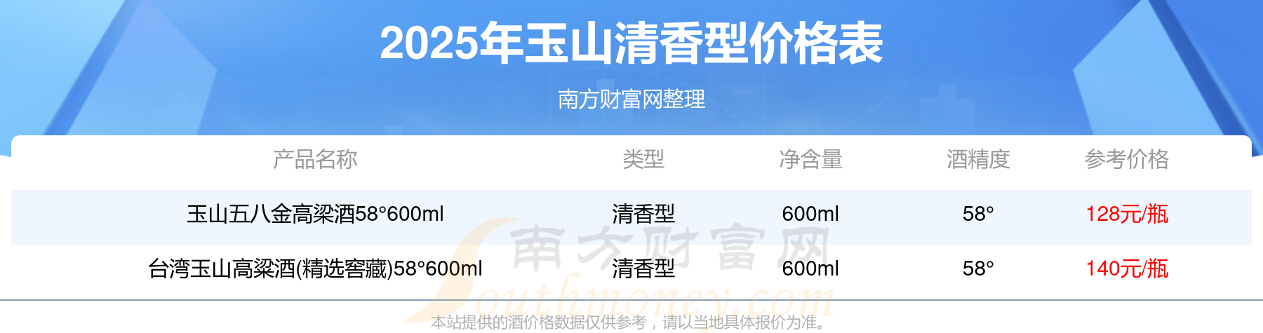 2025年,玉山清香型酒價(jià)格最高的是臺(tái)灣玉山高粱酒(精選窖藏)58°600ml,參考價(jià)140元,最低的是玉山五八金高梁酒58°600ml,參考價(jià)128元,價(jià)格高低差為12元。