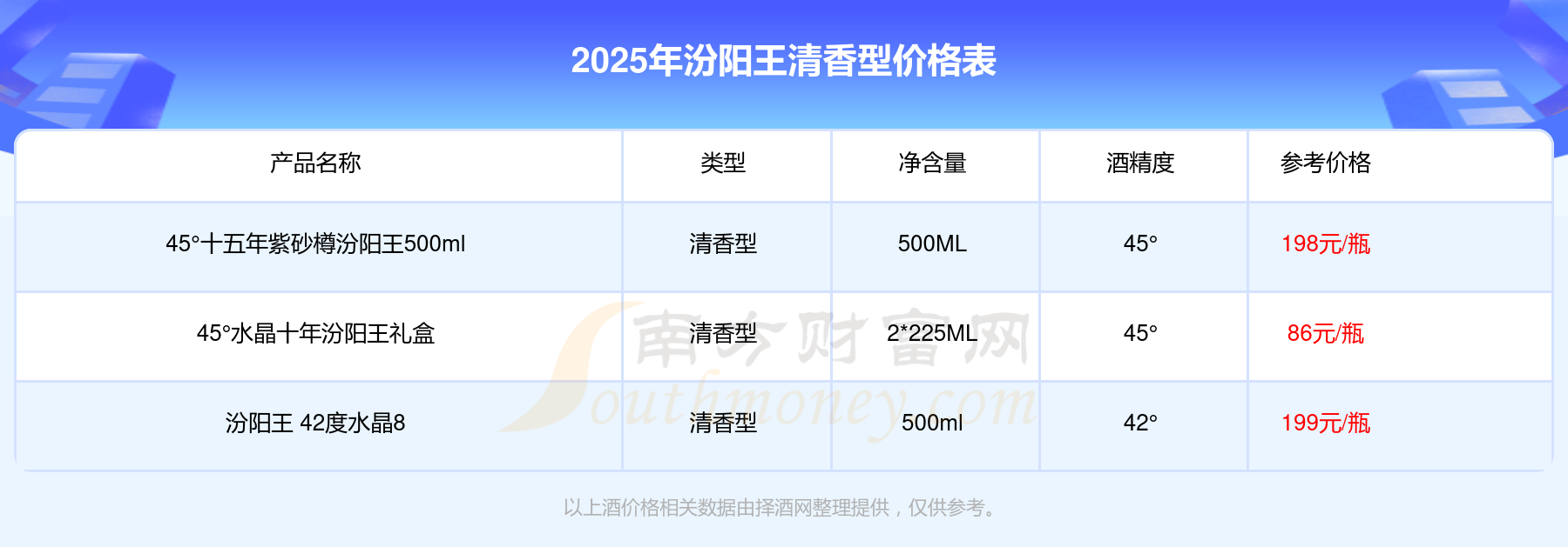 2025年汾陽王清香型酒汾陽王 42度水晶8、45°十五年紫砂樽汾陽王500ml、45°水晶十年汾陽王禮盒等最新價格如下: