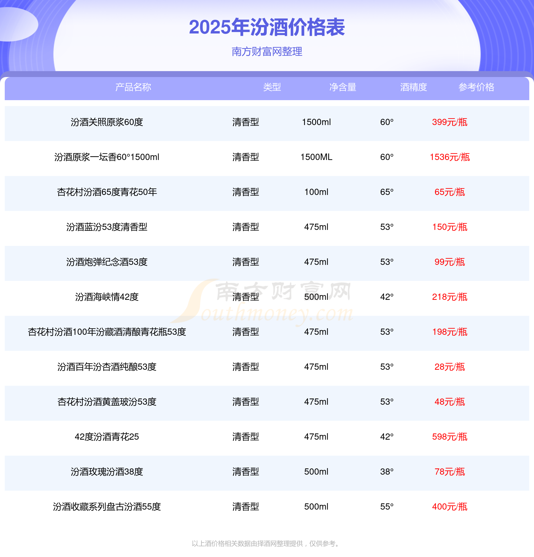 汾酒原漿一壇香60°3000ml參考價2180元/瓶、汾酒原漿一壇香60°1500ml參考價1536元/瓶、42度汾酒青花25參考價598元/瓶、汾酒收藏系列盤古汾酒55度參考價400元/瓶、汾酒關(guān)照原漿60度參考價399元/瓶、汾酒青花20單瓶禮盒裝參考價388元/瓶、汾酒海峽情42度參考價218元/瓶。