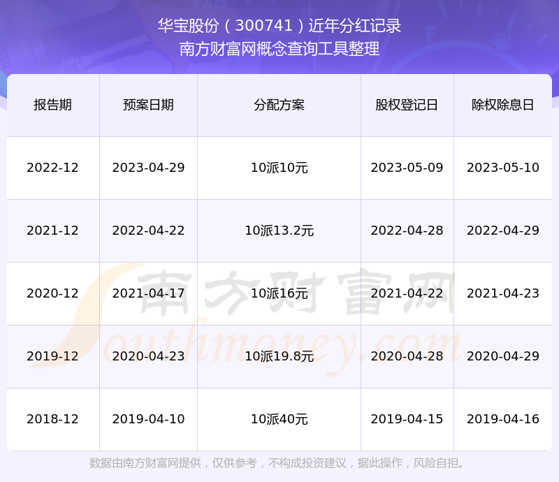 華寶股份最新一次公布的分紅方案為10派10元。本次權(quán)益分派股權(quán)登記日為2023年5月9日,除權(quán)除息日為2023年5月10日,派息日為2023年5月10日。
