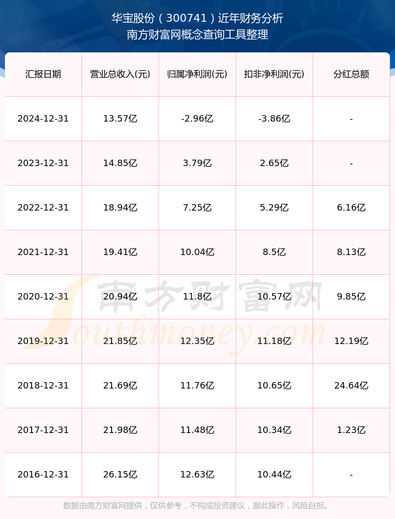 2024年華寶股份總營收13.57億,同比增長-8.61%;凈利潤-2.96億,同比增長-178.19%;銷售毛利率54.76%。