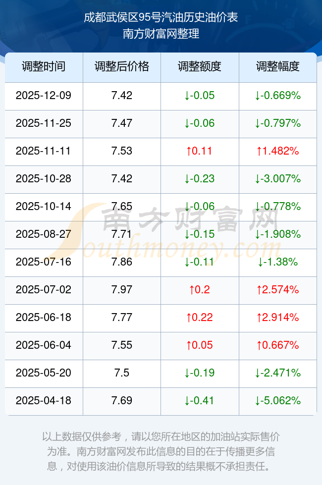 成都武侯區(qū)95號(hào)汽油歷史油價(jià)表