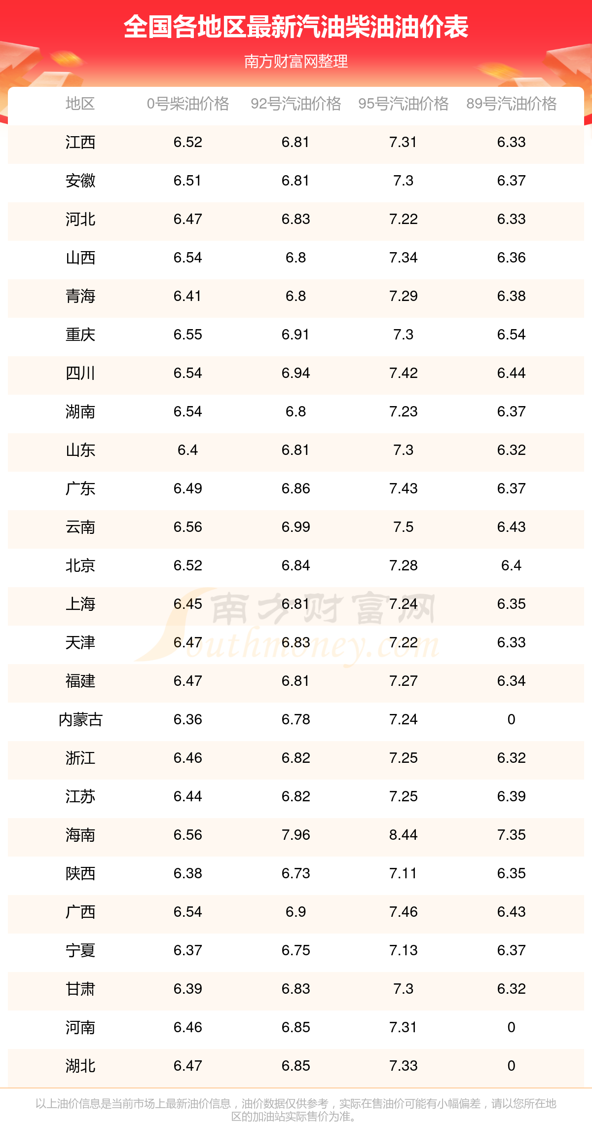 以上數(shù)據(jù)僅供參考,請以您所在地區(qū)的加油站實際售價為準(zhǔn)。南方財富網(wǎng)發(fā)布此信息的目的在于傳播更多信息,對使用該油價信息所導(dǎo)致的結(jié)果概不承擔(dān)責(zé)任。