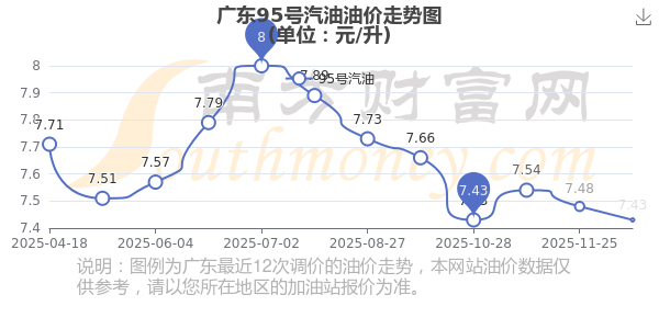 12月10日,廣東95號汽油的價(jià)格是7.43元每升,本次的調(diào)整時(shí)間為12月9日,對比上次的調(diào)整下降了0.05元,下降0.668%,12月22日24時(shí)為下一輪油價(jià)調(diào)整時(shí)間,還有12.81天。