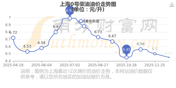 12月10日,上海0號(hào)柴油的價(jià)格是6.45元每升,本次的調(diào)整時(shí)間為12月9日,對(duì)比上次的調(diào)整下降了0.05元,下降0.769%,下次調(diào)整時(shí)間為12月22日24時(shí),還有12.79天。