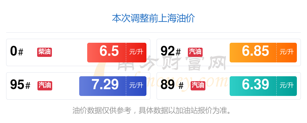 12月10日,上海汽油、柴油每升最新價(jià)格為:調(diào)整時(shí)間為12月9日,92號(hào)汽油為6.81元,下降了0.04元,下降幅達(dá)0.58%;95號(hào)汽油為7.24元,下降了0.05元,下降幅達(dá)0.69%;89號(hào)汽油為6.35元,下降了0.04元,下降幅達(dá)0.63%;0號(hào)柴油為6.45元,下降了0.05元,下降幅達(dá)0.77%。