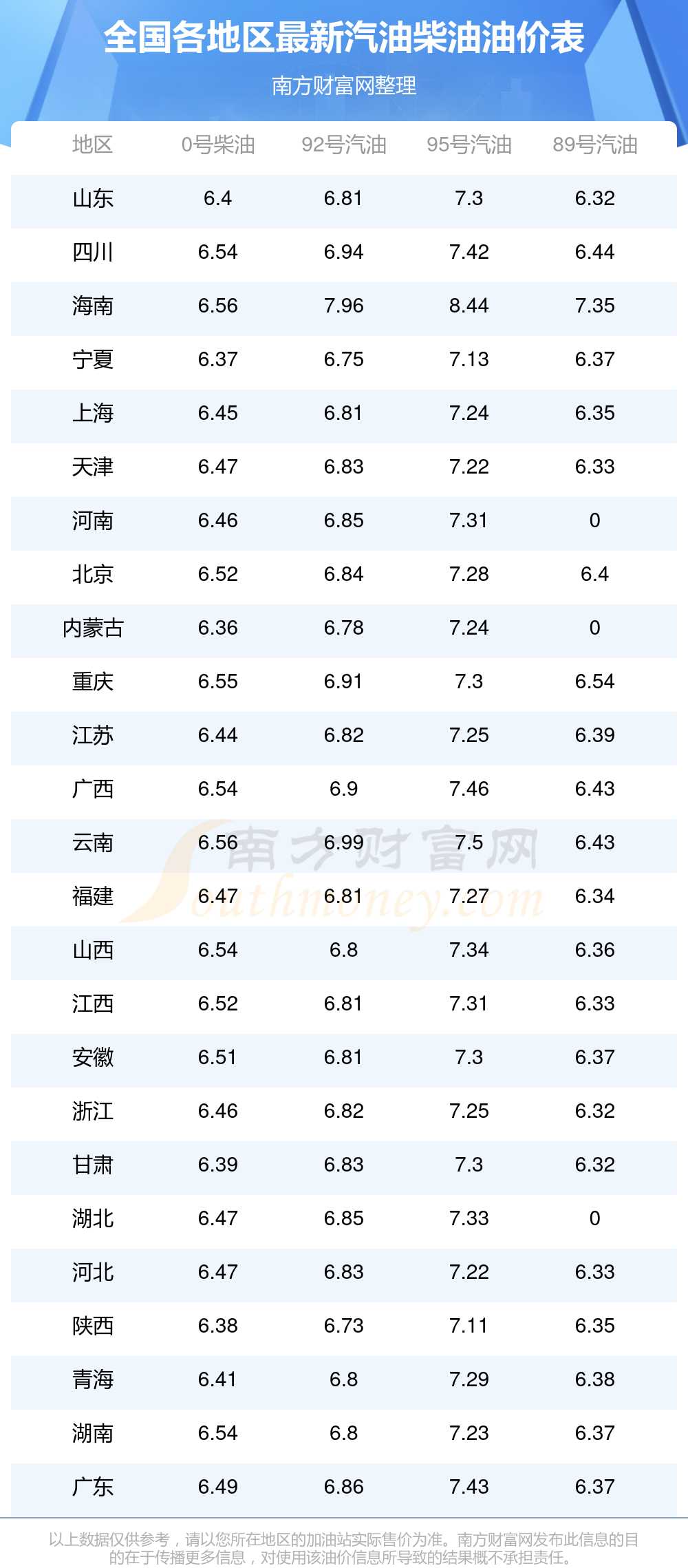 以上油價信息是當前市場上最新油價信息,油價數據僅供參考,實際在售油價可能有小幅偏差,請以您所在地區(qū)的加油站實際售價為準。