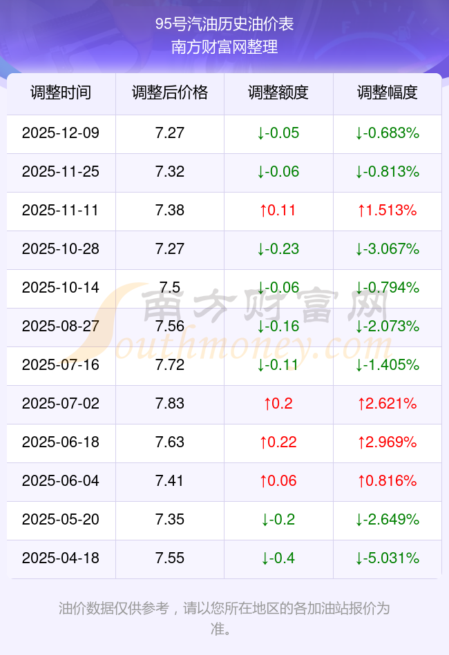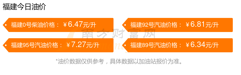 油價調(diào)整最新消息:下一輪油價調(diào)整時間12月22日24時。12月10日福建汽油、柴油每升的價格具體為:本輪油價調(diào)整時間為12月9日,92號汽油是6.81元,降了0.05元,降幅達0.73%;95號汽油是7.27元,降了0.05元,降幅達0.68%;89號汽油為6.34元,降了0.04元,降幅達0.63%;0號柴油為6.47元,降了0.05元,降幅達0.77%。