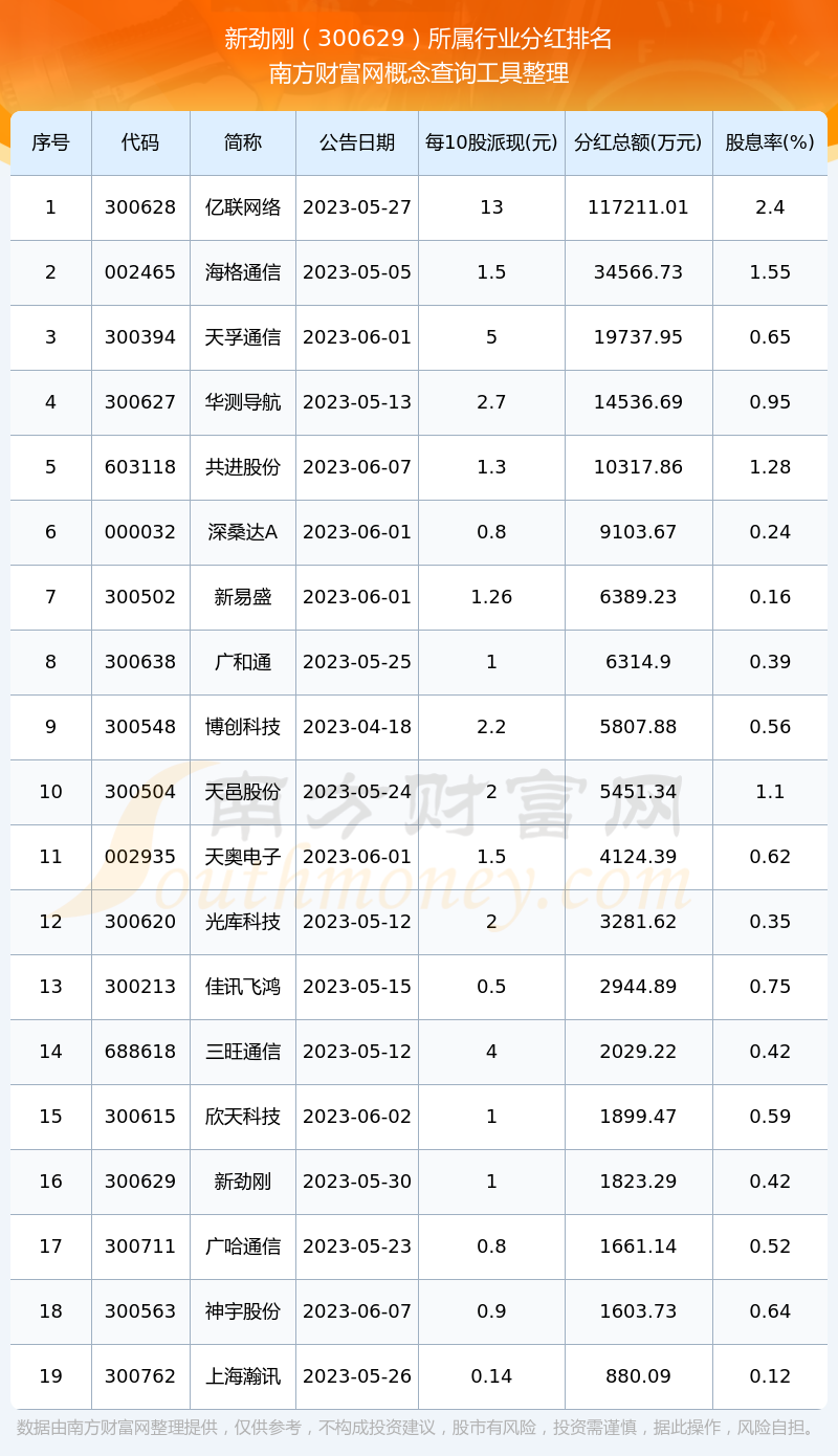 按照南方財(cái)富網(wǎng)趨勢選股系統(tǒng)統(tǒng)計(jì),新勁剛所屬行業(yè)為通信設(shè)備行業(yè),通信設(shè)備行業(yè)分紅排名情況如下表: