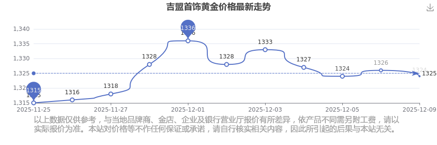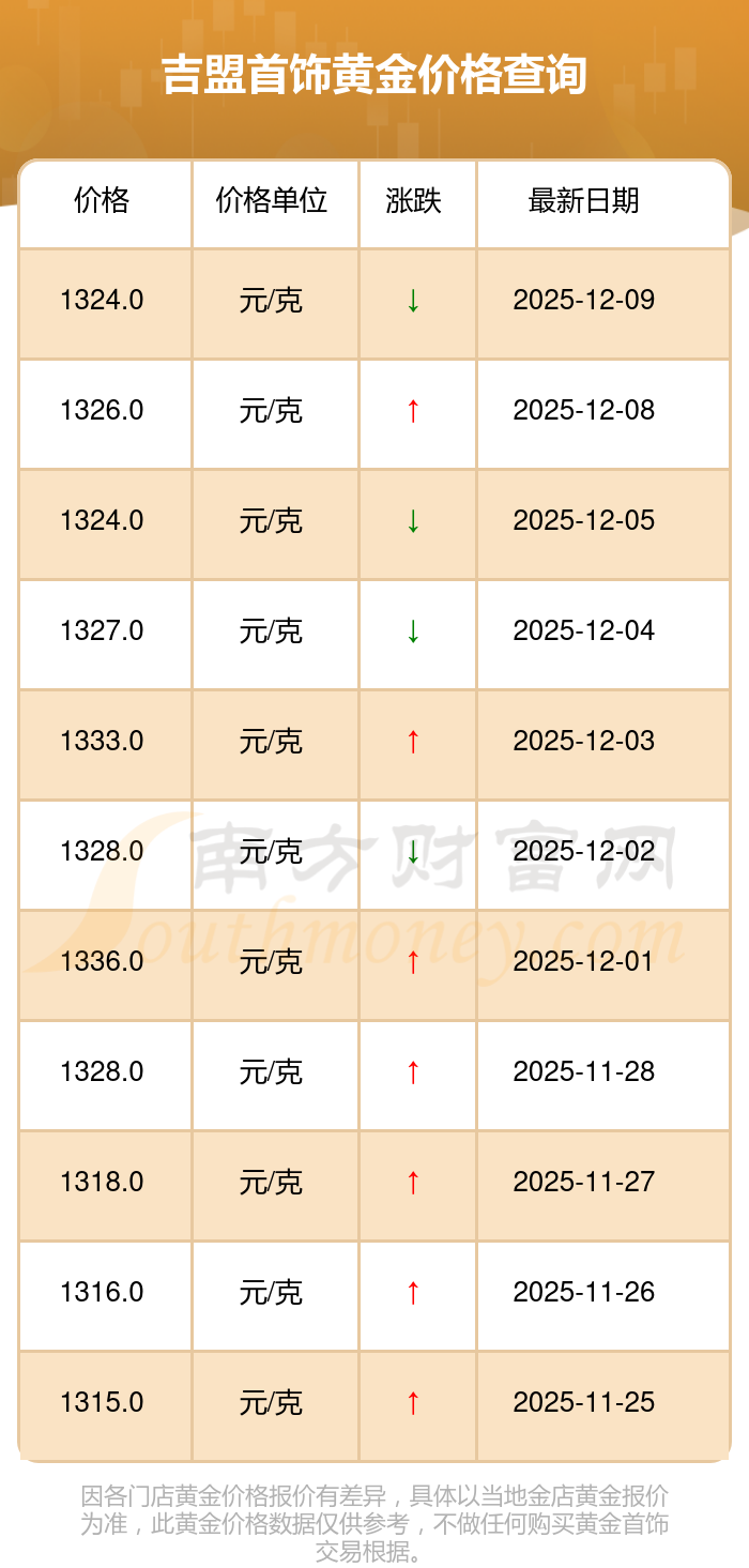 今日吉盟首飾 黃金價(jià)格,最新確定為1324.0元/克。