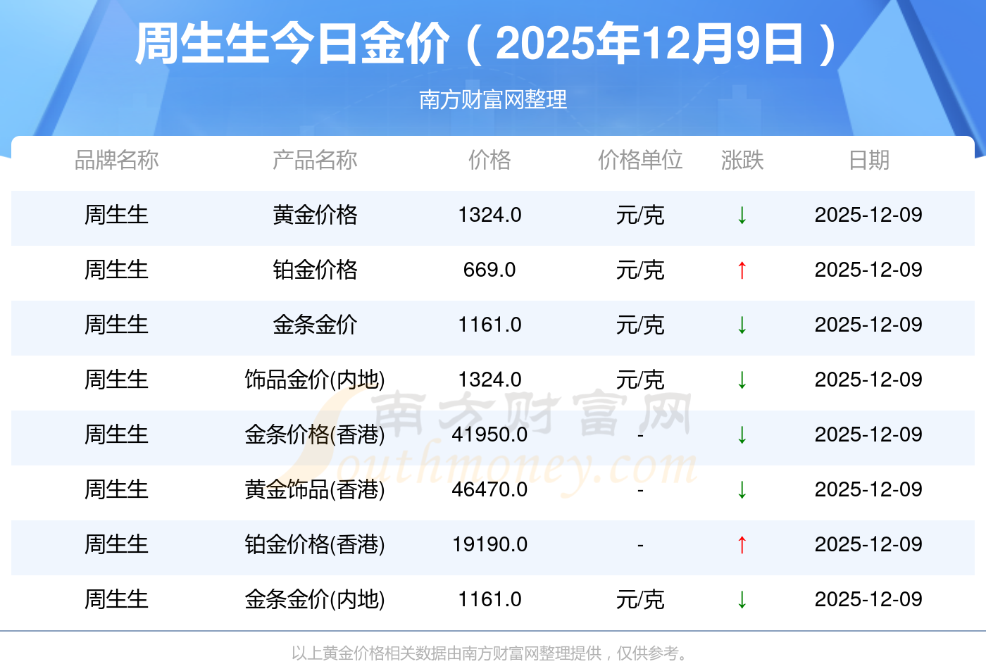 2025年12月9日周大福、周大福、周大福、周大福、周大福、周大福、周大福、周六福、周六福、周六福、周六福等各大金店品牌黃金價(jià)格最新價(jià)格如下:周大福黃金價(jià)格1328.0元/克,周大福鉑金價(jià)格669.0元/克,周大福飾品金價(jià)(內(nèi)地)1328.0元/克,周大福黃金飾品(香港)46520.0,周大福鉑金價(jià)格(香港)19190.0,周大福金條價(jià)格(香港)41960.0,周大福金條金價(jià)(內(nèi)地)1165.0元/克,周六福黃金價(jià)格1289.0元/克,周六福鉑金價(jià)格613.0元/克,周六福PT999鉑金價(jià)格613.0元/克,周六福金條價(jià)格1184.0元/克。