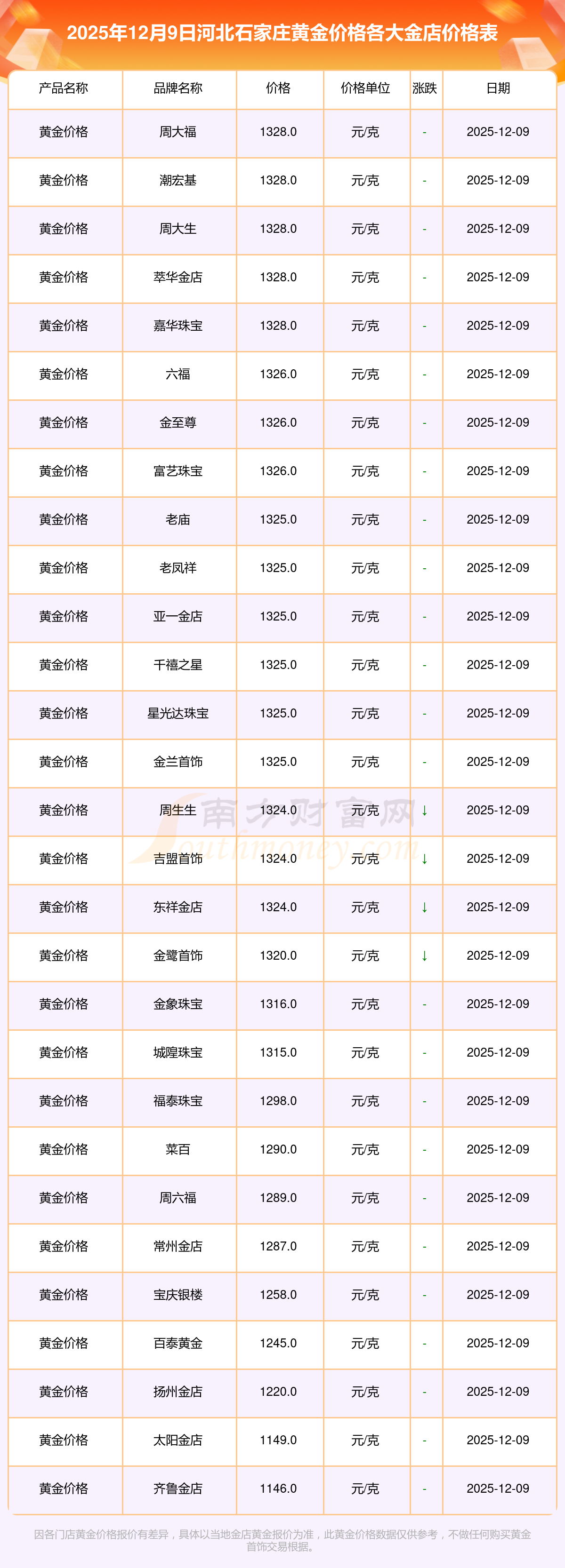 今天是2025年12月9日,河北石家莊周大福、周大福、周大福、周大福、周大福、周大福、周大福、周六福、周六福、周六福、周六福等各大金店品牌黃金價(jià)格最新價(jià)格如下:周大福1328.0元/克、周大福669.0元/克、周大福1328.0元/克、周大福46520.0、周大福19190.0、周大福41960.0、周大福1165.0元/克、周六福1289.0元/克、周六福613.0元/克、周六福613.0元/克、周六福1184.0元/克。