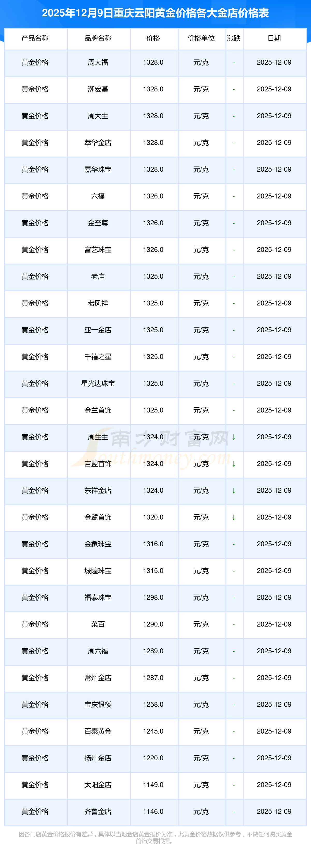 2025年12月9日重慶云陽周大福、周大福、周大福、周大福、周大福、周大福、周大福、周六福、周六福、周六福、周六福等各大金店品牌黃金價格最新價格行情來了,如下:周大福黃金價格1328.0元/克,周大福鉑金價格669.0元/克,周大福飾品金價(內地)1328.0元/克,周大福黃金飾品(香港)46520.0,周大福鉑金價格(香港)19190.0,周大福金條價格(香港)41960.0,周大福金條金價(內地)1165.0元/克,周六福黃金價格1289.0元/克,周六福鉑金價格613.0元/克,周六福PT999鉑金價格613.0元/克,周六福金條價格1184.0元/克。