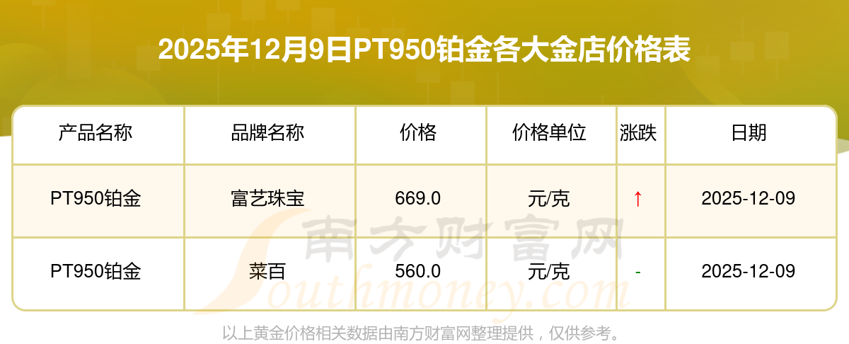 今天是2025年12月9日,周大福、周大福、周大福、周大福、周大福、周大福、周大福、周六福、周六福、周六福、周六福等各大金店品牌PT950鉑金最新價(jià)格如下:周大福1328.0元/克、周大福669.0元/克、周大福1328.0元/克、周大福46520.0、周大福19190.0、周大福41960.0、周大福1165.0元/克、周六福1289.0元/克、周六福613.0元/克、周六福613.0元/克、周六福1184.0元/克。