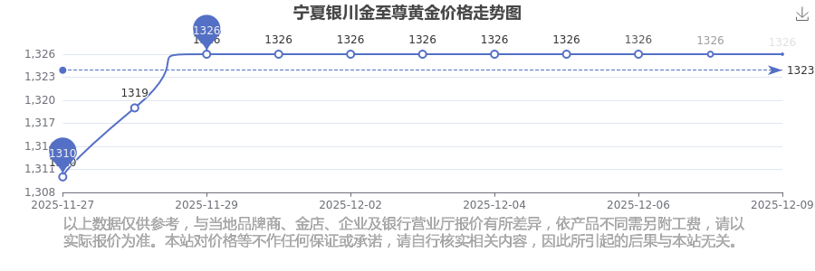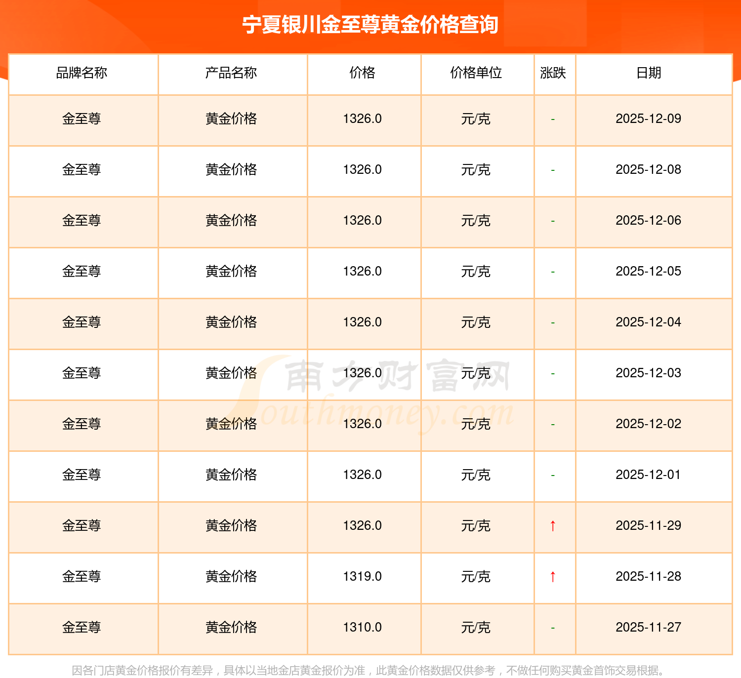 寧夏銀川金至尊 2025年12月9日的黃金價格價位為 1326.0元/克。
