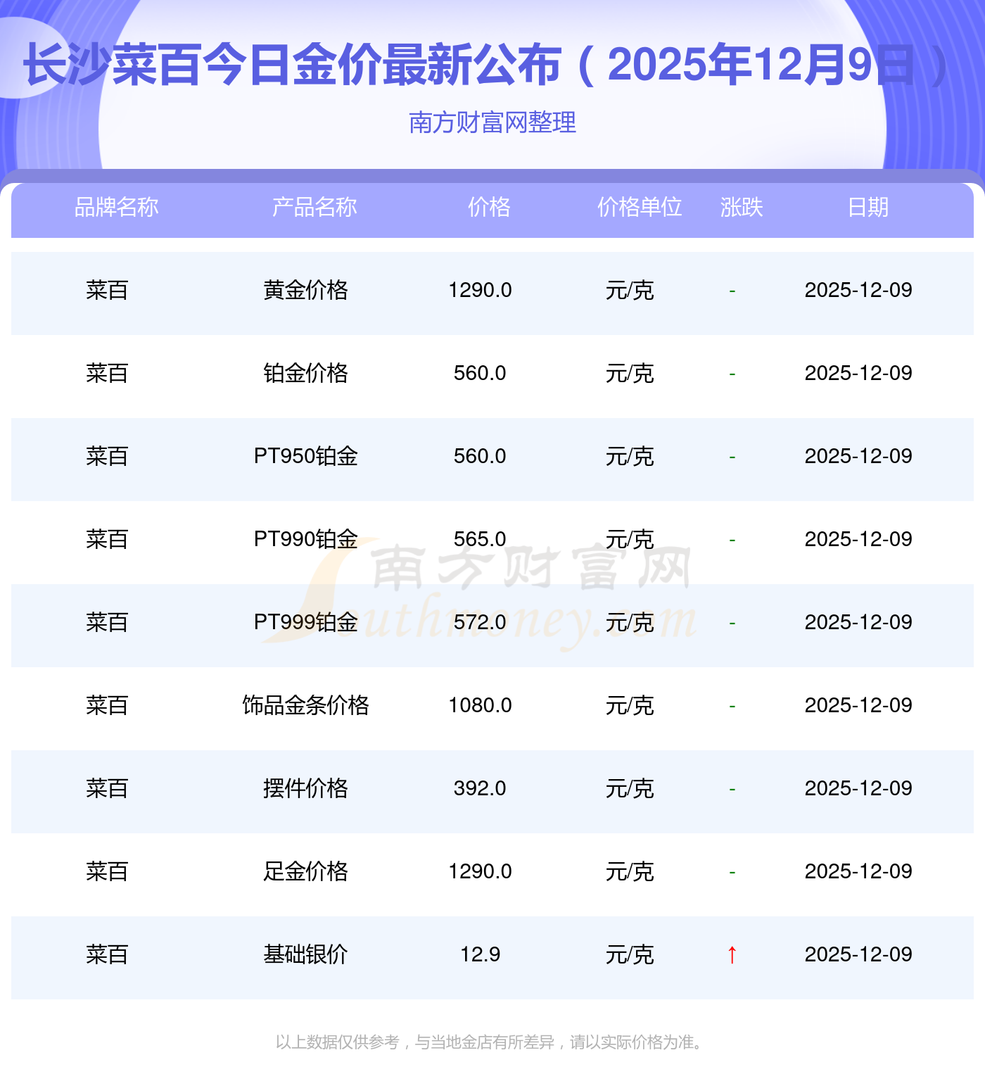2025年12月9日長沙菜百最新價(jià)格:黃金價(jià)格1328.0元/克,鉑金價(jià)格669.0元/克,飾品金價(jià)(內(nèi)地)1328.0元/克,黃金飾品(香港)46520.0,鉑金價(jià)格(香港)19190.0,金條價(jià)格(香港)41960.0,金條金價(jià)(內(nèi)地)1165.0元/克,黃金價(jià)格1289.0元/克,鉑金價(jià)格613.0元/克,PT999鉑金價(jià)格613.0元/克,金條價(jià)格1184.0元/克。
