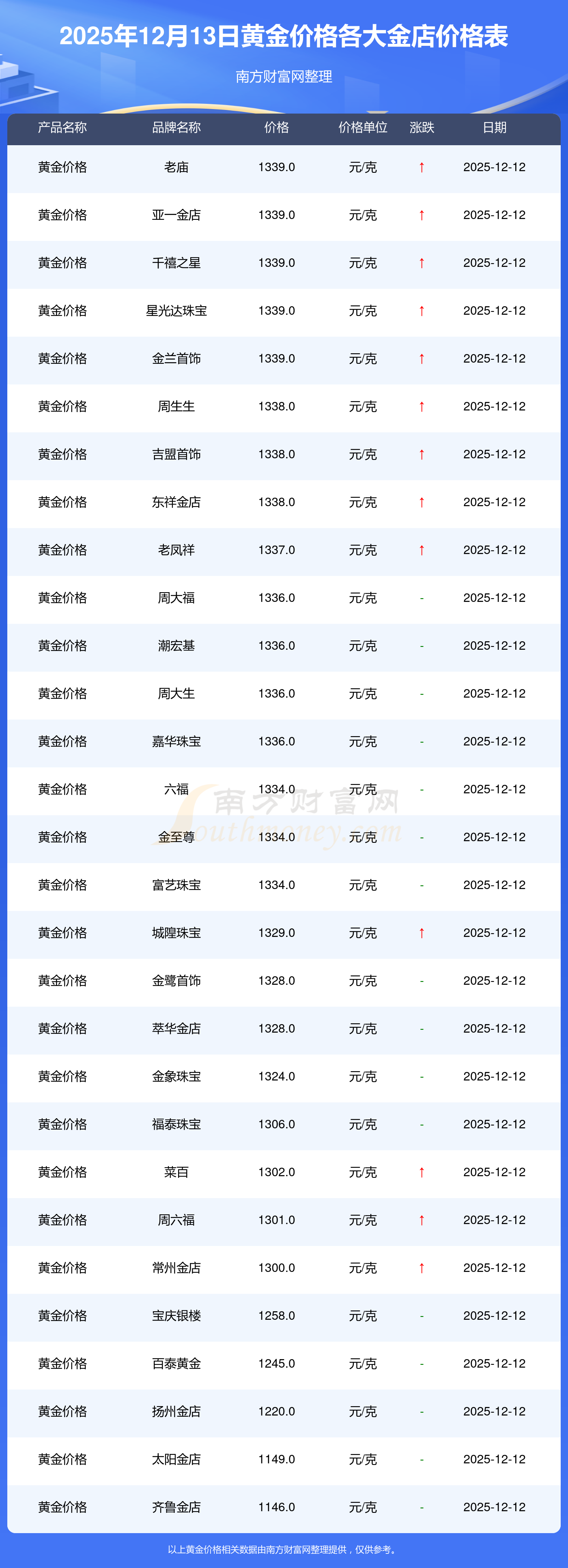 2025年12月13日周大福、周大福、老鳳祥、老鳳祥、老廟、老廟、周生生、周生生、周大福、周大福、周大福等各大金店品牌黃金價格最新價格如下:周大福黃金價格1336.0元/克,周大福鉑金價格681.0元/克,老鳳祥黃金價格1337.0元/克,老鳳祥鉑金價格650.0元/克,老廟黃金價格1339.0元/克,老廟鉑金價格600.0元/克,周生生黃金價格1338.0元/克,周生生鉑金價格681.0元/克,周大福飾品金價(內地)1336.0元/克,周大福黃金飾品(香港)47410.0,周大福鉑金價格(香港)19550.0。