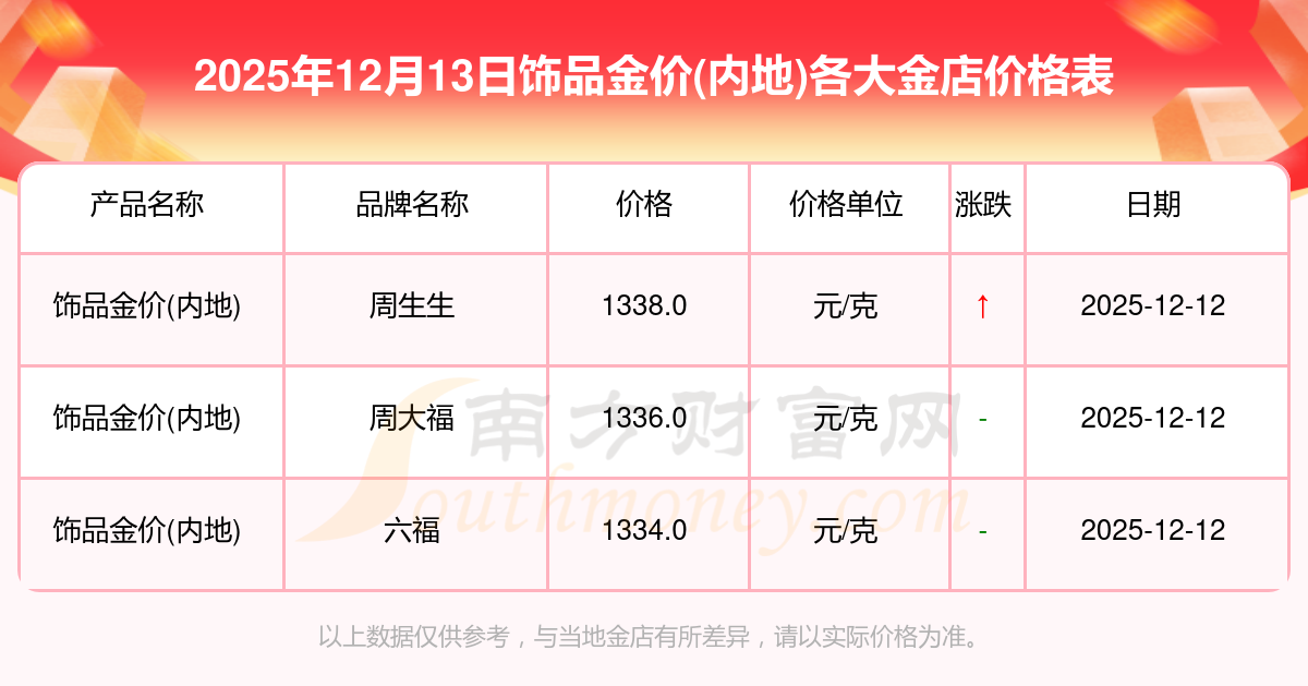 今天是2025年12月13日,周大福、周大福、老鳳祥、老鳳祥、老廟、老廟、周生生、周生生、周大福、周大福、周大福等各大金店品牌飾品金價(內(nèi)地)最新價格如下:周大福1336.0元/克、周大福681.0元/克、老鳳祥1337.0元/克、老鳳祥650.0元/克、老廟1339.0元/克、老廟600.0元/克、周生生1338.0元/克、周生生681.0元/克、周大福1336.0元/克、周大福47410.0、周大福19550.0。