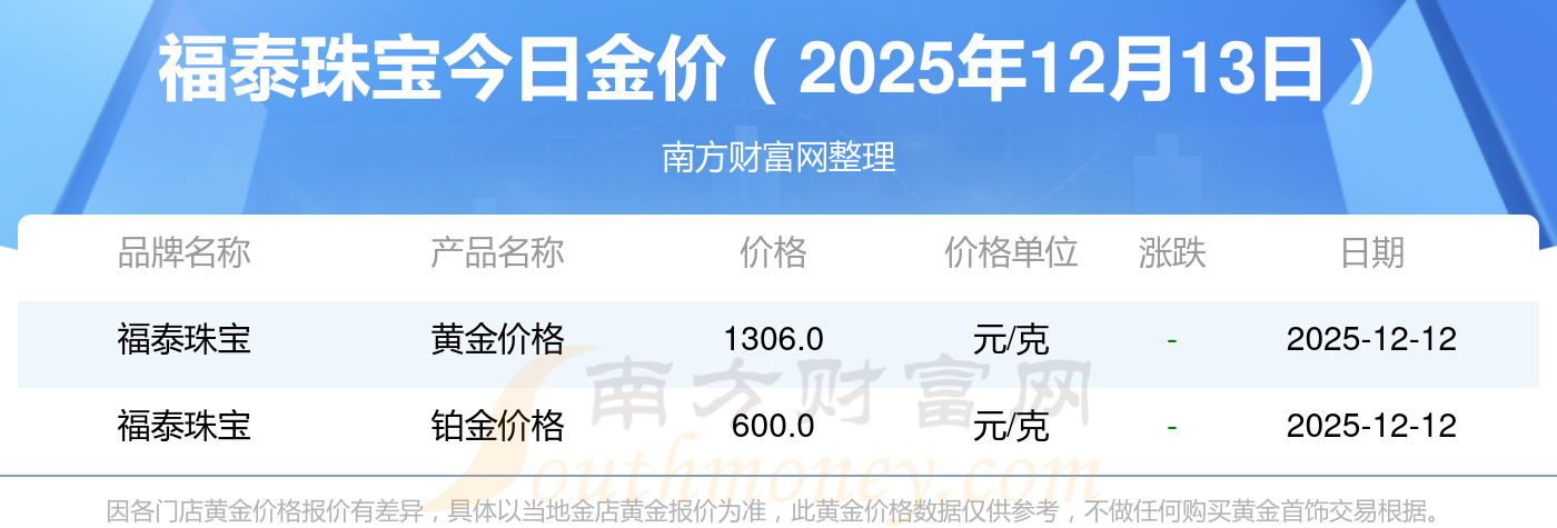 2025年12月13日各大金店黃金價格最新價格:周大福1336.0元/克,周大福681.0元/克,老鳳祥1337.0元/克,老鳳祥650.0元/克,老廟1339.0元/克,老廟600.0元/克,周生生1338.0元/克,周生生681.0元/克,周大福1336.0元/克,周大福47410.0,周大福19550.0。