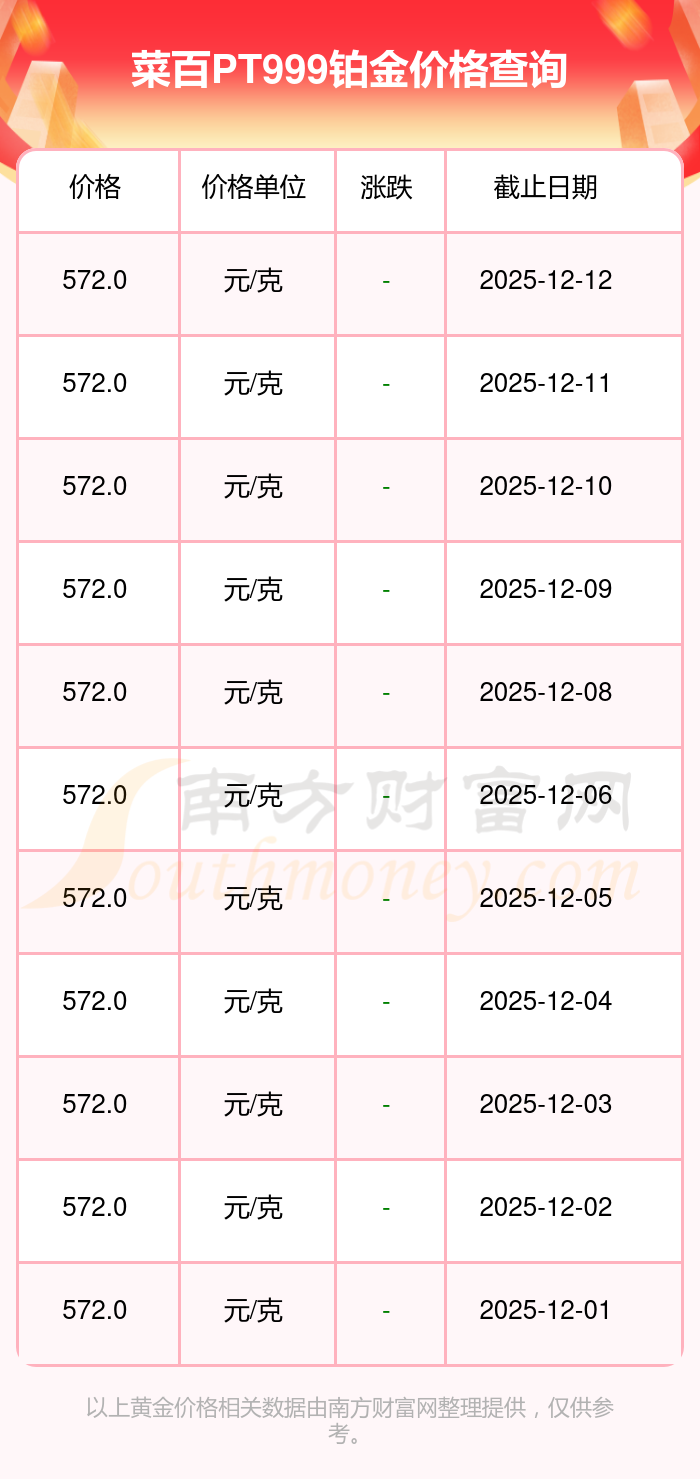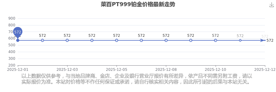 菜百 PT999鉑金于今日的最新掛牌價(jià)為572.0元/克。