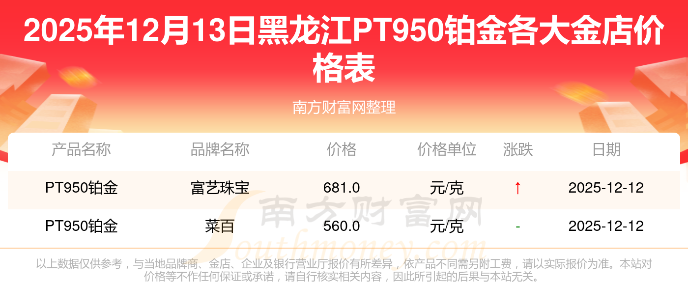 今天是2025年12月13日,黑龍江周大福、周大福、老鳳祥、老鳳祥、老廟、老廟、周生生、周生生、周大福、周大福、周大福等各大金店品牌PT950鉑金最新價格如下:周大福1336.0元/克、周大福681.0元/克、老鳳祥1337.0元/克、老鳳祥650.0元/克、老廟1339.0元/克、老廟600.0元/克、周生生1338.0元/克、周生生681.0元/克、周大福1336.0元/克、周大福47410.0、周大福19550.0。
