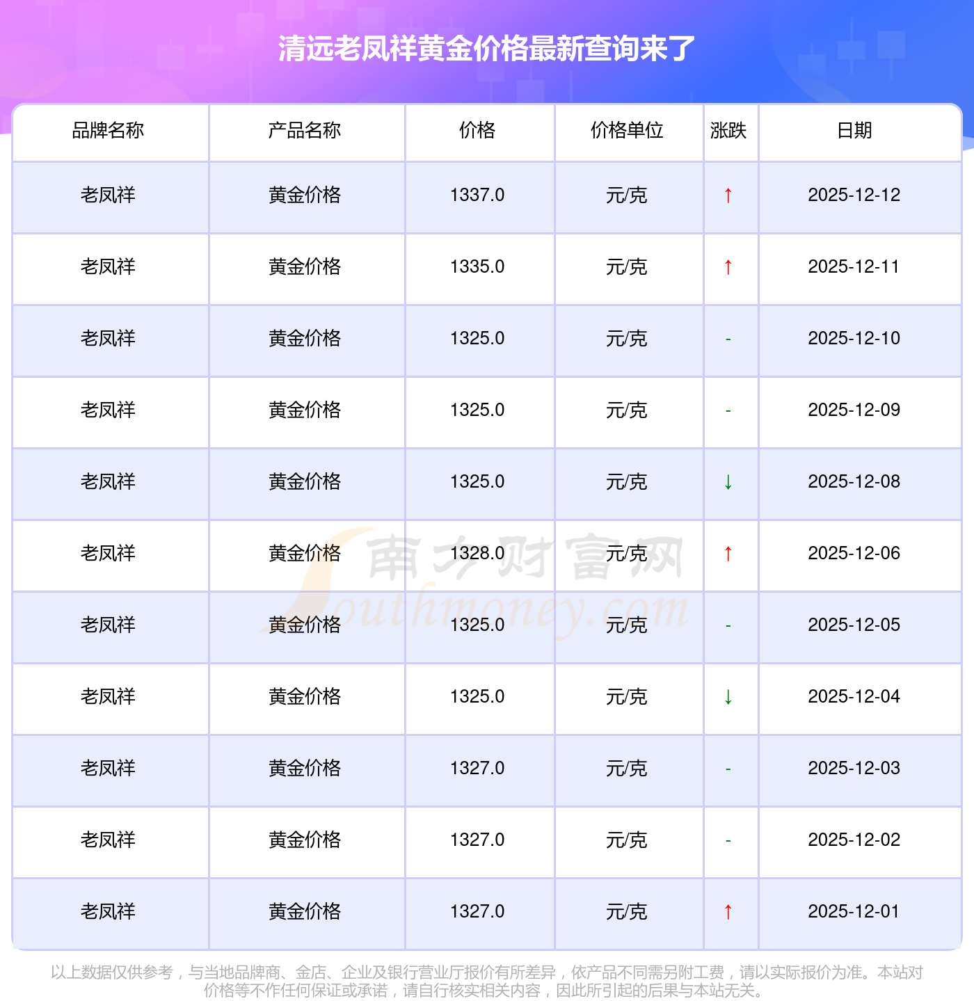 今日(2025年12月13日)清遠(yuǎn)老鳳祥黃金價(jià)格:1337.0元/克。