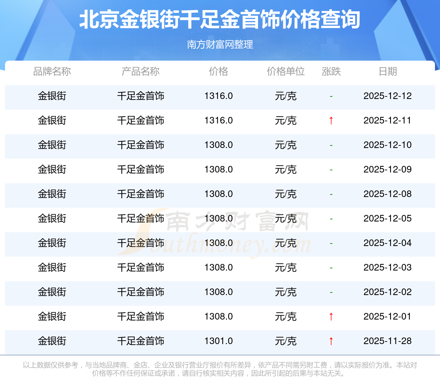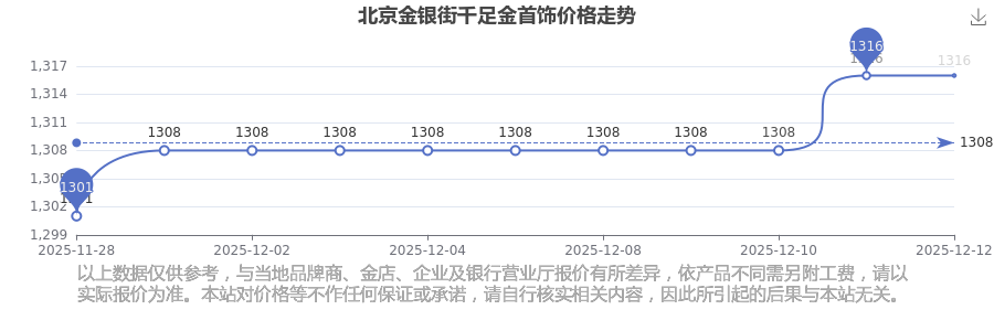 2025年12月13日,北京金銀街千足金首飾每克的售賣價位為1316.0元/克。