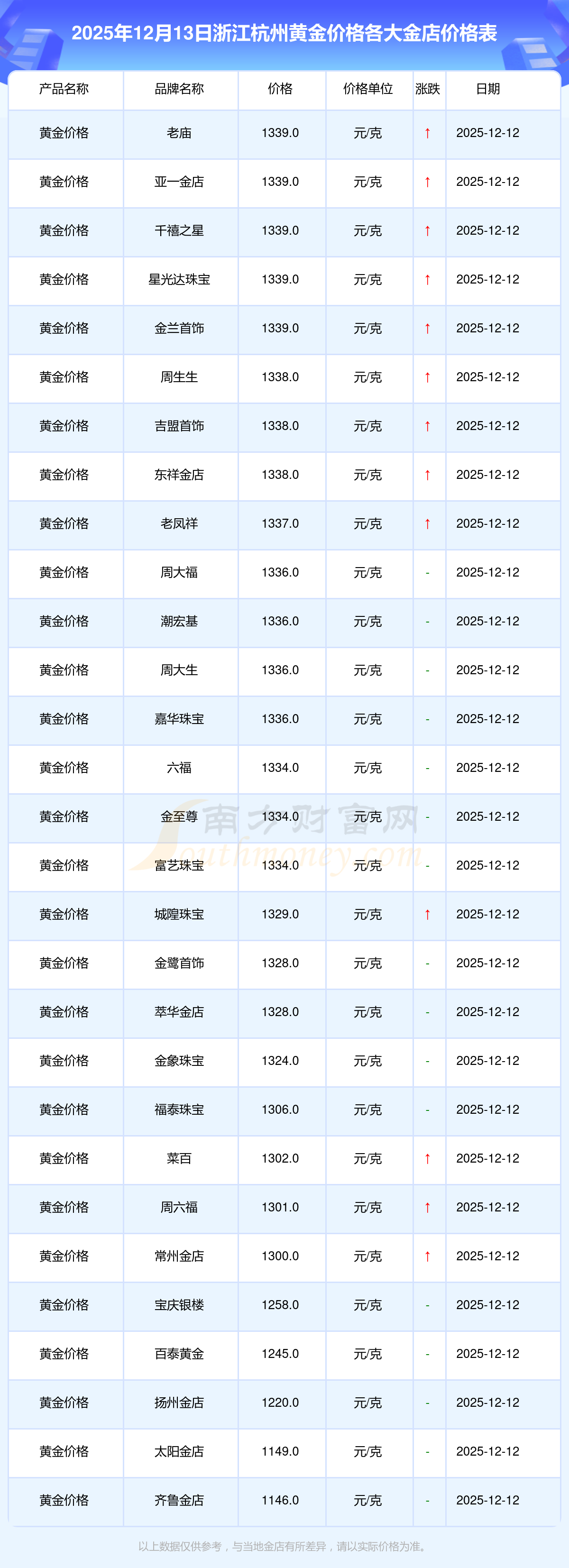 2025年12月13日,浙江杭州周大福、周大福、老鳳祥、老鳳祥、老廟、老廟、周生生、周生生、周大福、周大福、周大福等各大金店品牌黃金價(jià)格今日價(jià)格行情最新來(lái)了:周大福1336.0元/克、周大福681.0元/克、老鳳祥1337.0元/克、老鳳祥650.0元/克、老廟1339.0元/克、老廟600.0元/克、周生生1338.0元/克、周生生681.0元/克、周大福1336.0元/克、周大福47410.0、周大福19550.0。