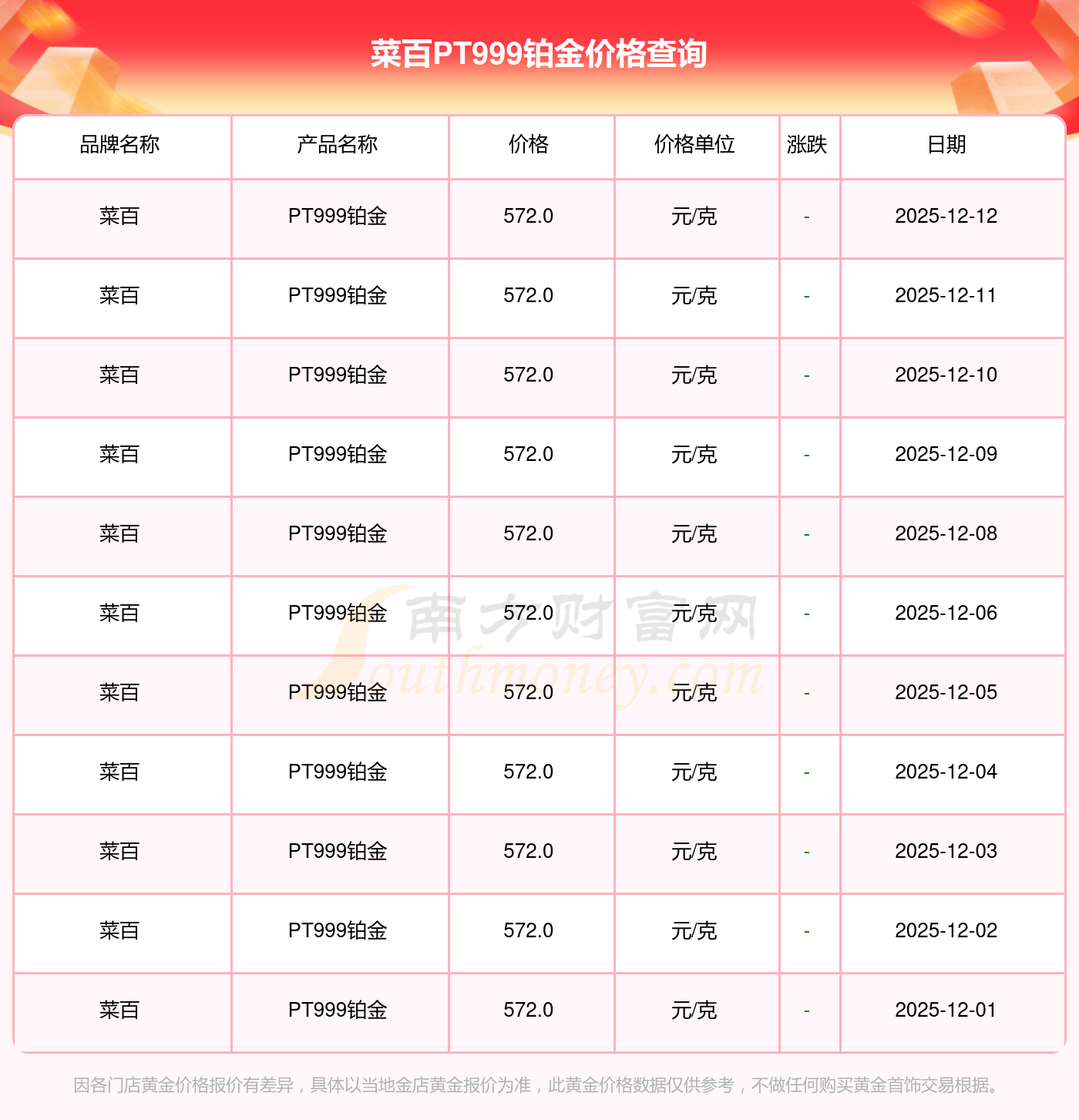 今日(2025年12月13日)菜百PT999鉑金價格為572.0元/克。