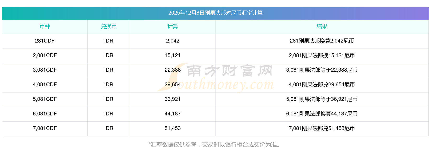 南方財(cái)富網(wǎng)為您提供剛果法郎對尼幣匯率最新價格詳情。