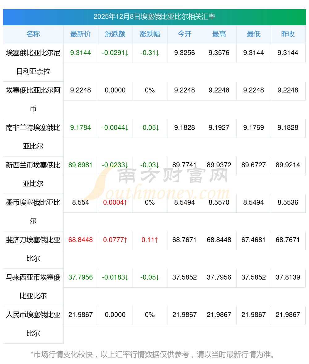 根據(jù)2025年12月8日匯率,埃塞俄比亞比爾兌換人民幣匯率最新價0.045500,今開價0.0455,昨收價0.0455,最高價0.0455,最低價0.0455。