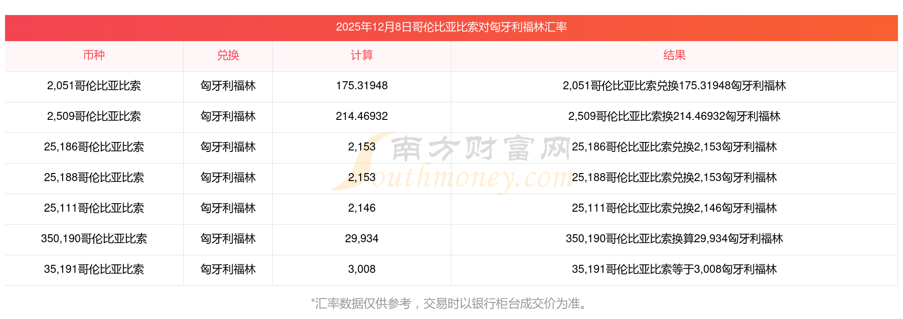 今天哥倫比亞比索換成匈牙利福林匯率中間價(jià)是多少?146哥倫比亞比索換多少?2025/12/08