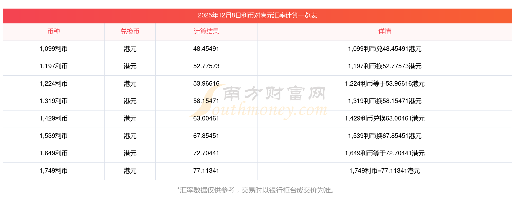 今天利幣轉(zhuǎn)換港元匯率價(jià)多少_怎么查詢 2025年12月8日