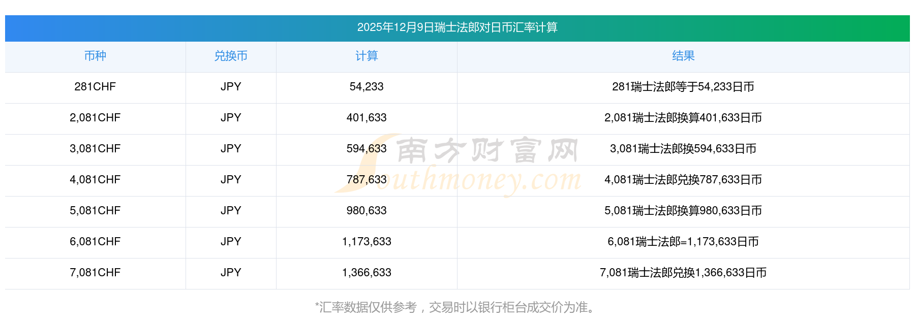現(xiàn)在瑞士法郎對日元匯率多少?12月9日