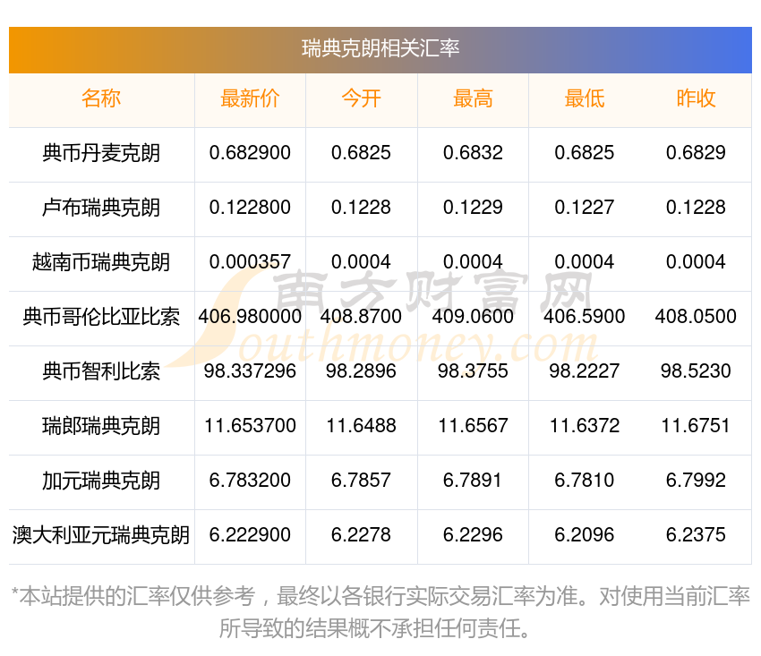 南方財(cái)富網(wǎng)為您提供瑞典克朗對(duì)瑞郎匯率最新價(jià)格詳情。