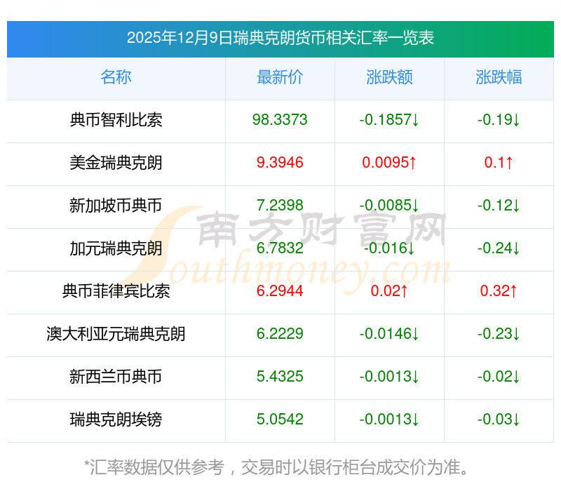 2025年12月9日瑞典克朗相關(guān)匯率查詢