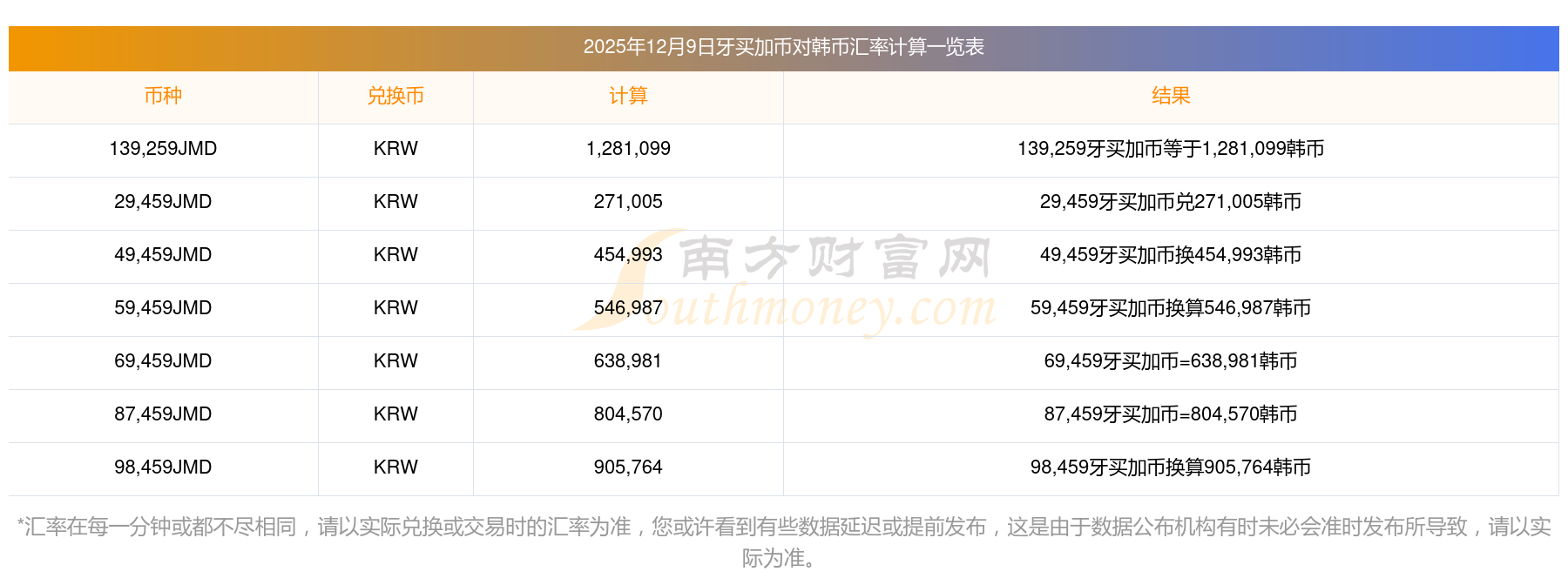 2025年12月9日牙買加幣與韓幣的兌換匯率計算如下: