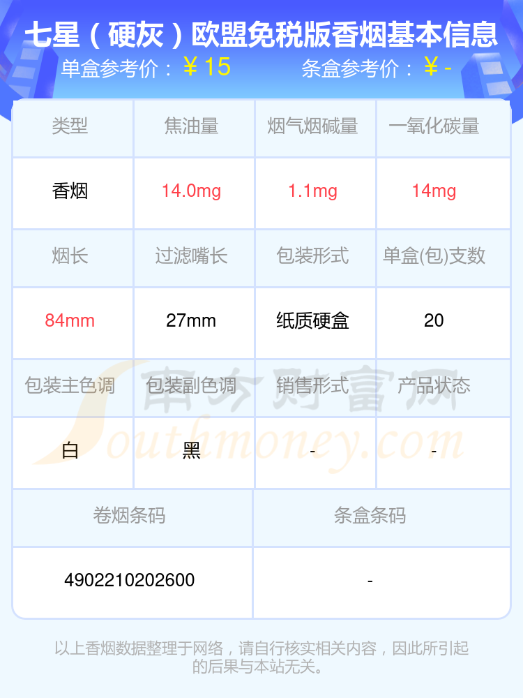 擇煙網(wǎng)為大家盤點了焦油量8~15mg的Seven Stars(七星)香煙,有七星(限量版)、七星(硬灰)歐盟免稅版、七星(薄荷12mg)、七星(臺灣黃標(biāo))、銀輝等,詳細(xì)價格如下: