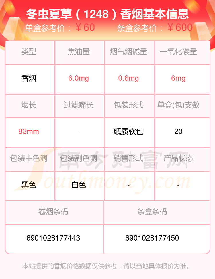 冬蟲(chóng)夏草(銀)參考價(jià)40元/包、冬蟲(chóng)夏草(金)參考價(jià)100元/包、冬蟲(chóng)夏草(銀)參考價(jià)40元/包、冬蟲(chóng)夏草(紅中支)參考價(jià)50元/包、冬蟲(chóng)夏草(雙中支)參考價(jià)40.0元/包、冬蟲(chóng)夏草(和潤(rùn))參考價(jià)55.0元/包、冬蟲(chóng)夏草(1248)參考價(jià)60.0元/包、冬蟲(chóng)夏草(黃金盛世)參考價(jià)100元/包、冬蟲(chóng)夏草(中支和潤(rùn))參考價(jià)80元/包、冬蟲(chóng)夏草(金細(xì))參考價(jià)100元/包等。