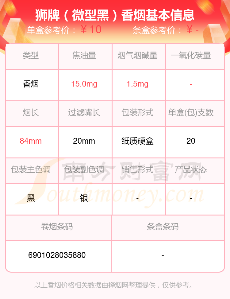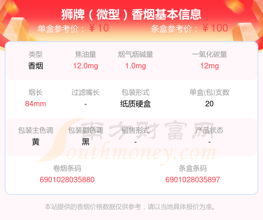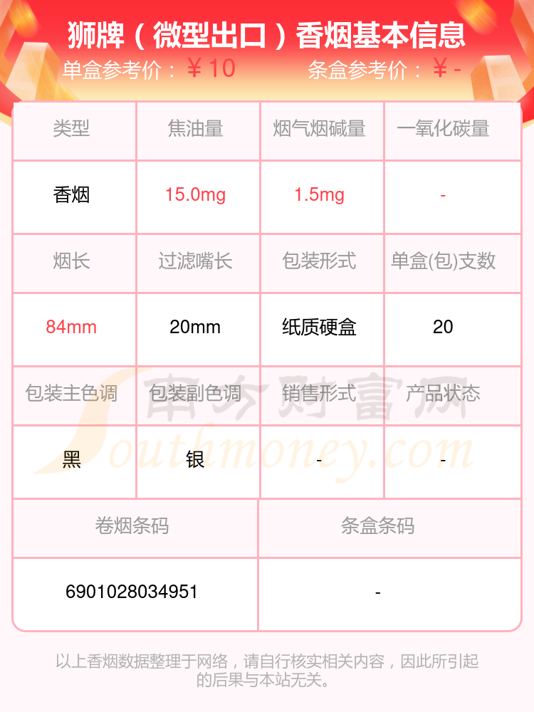 煙堿低于2mg的獅牌香煙有哪些?擇煙網(wǎng)為大家整理盤點(diǎn),分別有:獅牌(微型出口)、獅牌(微型黑)、獅牌(銀)、獅牌(錦繡成都)、獅牌(原香)、獅牌(雄風(fēng))、獅牌(閬苑傳奇)、獅牌(特香)、獅牌(微型)、獅牌(加勒比陽光)等,具體價(jià)格如下: