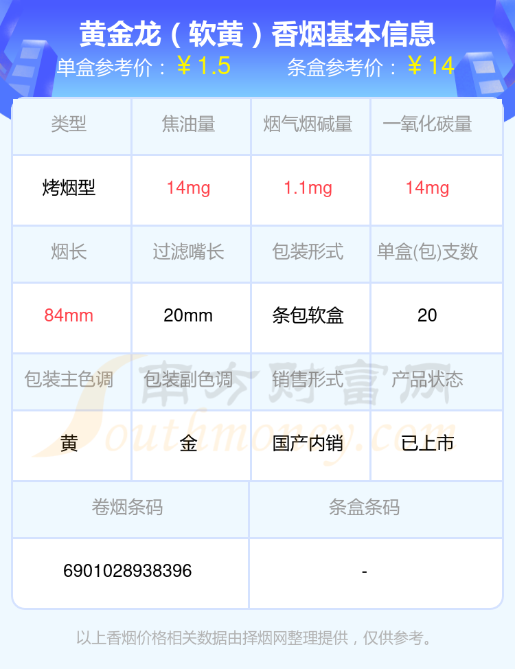 擇煙網(wǎng)為大家盤點了黃金龍香煙焦油量8-15mg左右的,分別有黃金龍(軟黃)、黃金龍(硬)、黃金龍(軟精制)等,具體價格如下: