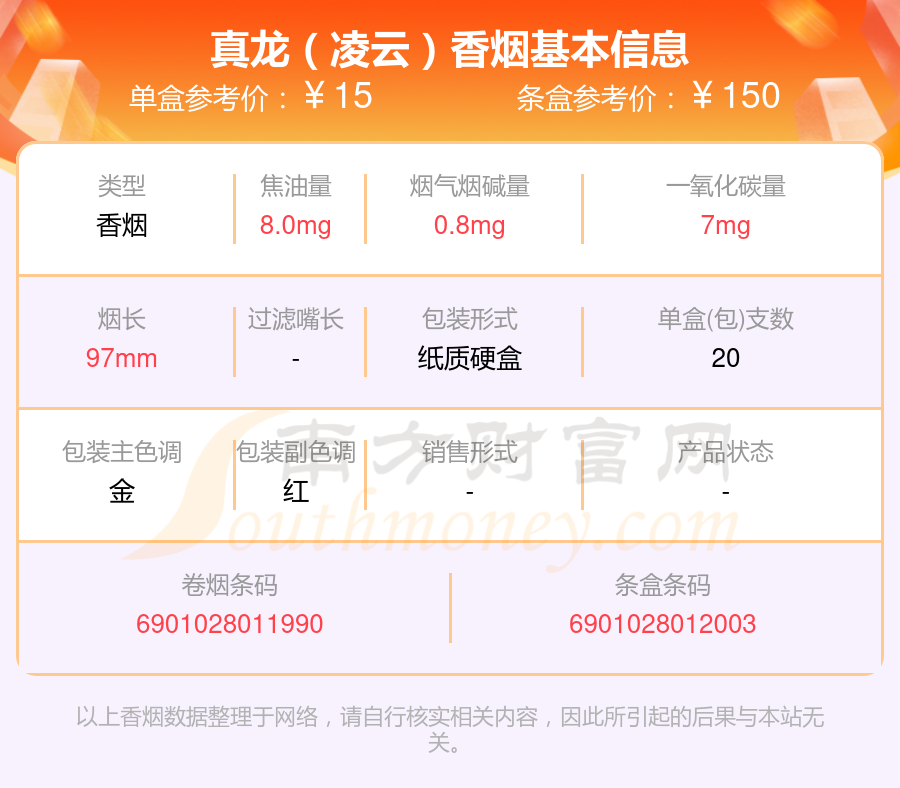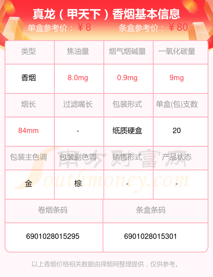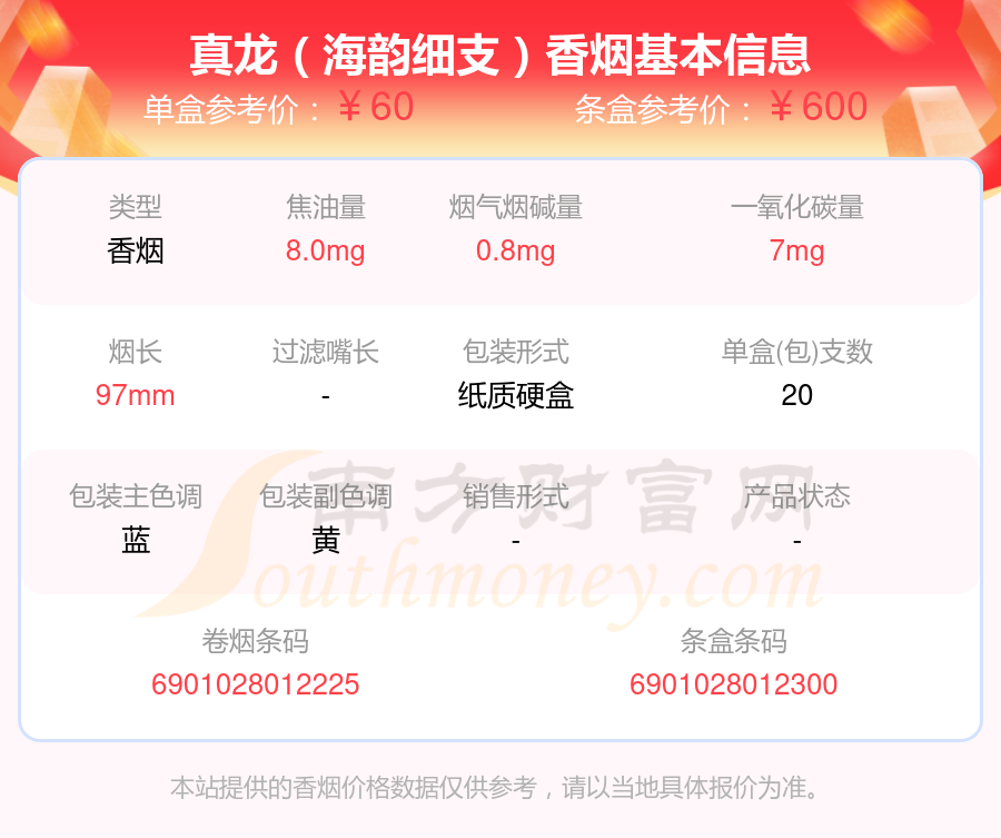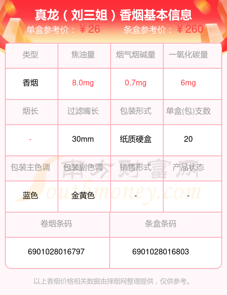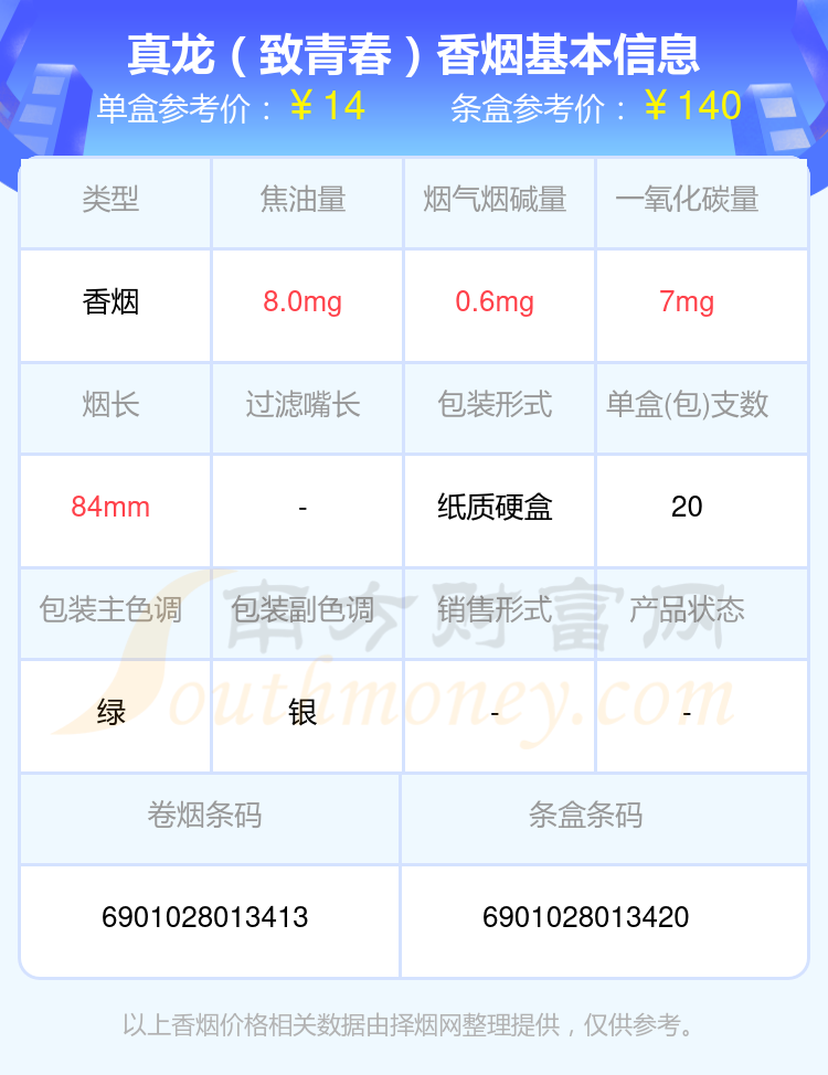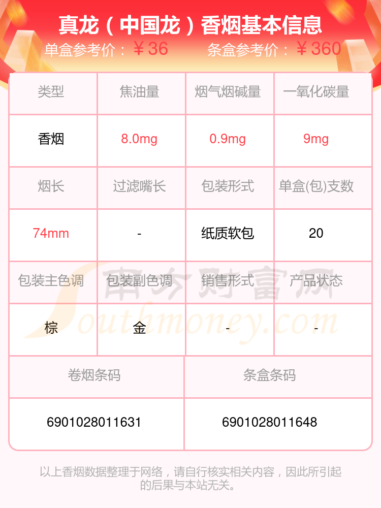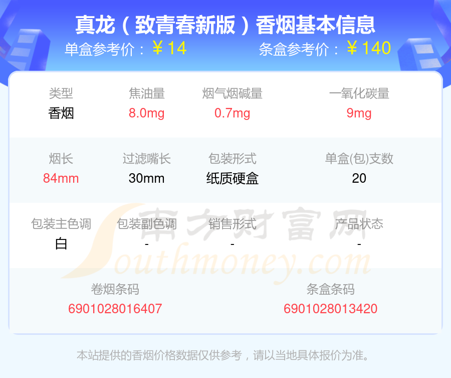 真龍(海韻中支)參考價(jià)40.0元/包、真龍(海韻細(xì)支)參考價(jià)60.0元/包、真龍(致青春)參考價(jià)14.0元/包、真龍(劉三姐)參考價(jià)26.0元/包、真龍(馨云)參考價(jià)13.0元/包、真龍(燃情時(shí)光)參考價(jià)23.0元/包、真龍(中國(guó)龍)參考價(jià)36.0元/包、真龍(甲天下)參考價(jià)8.0元/包、真龍(凌云)參考價(jià)15.0元/包、真龍(致青春新版)參考價(jià)14.0元/包等。